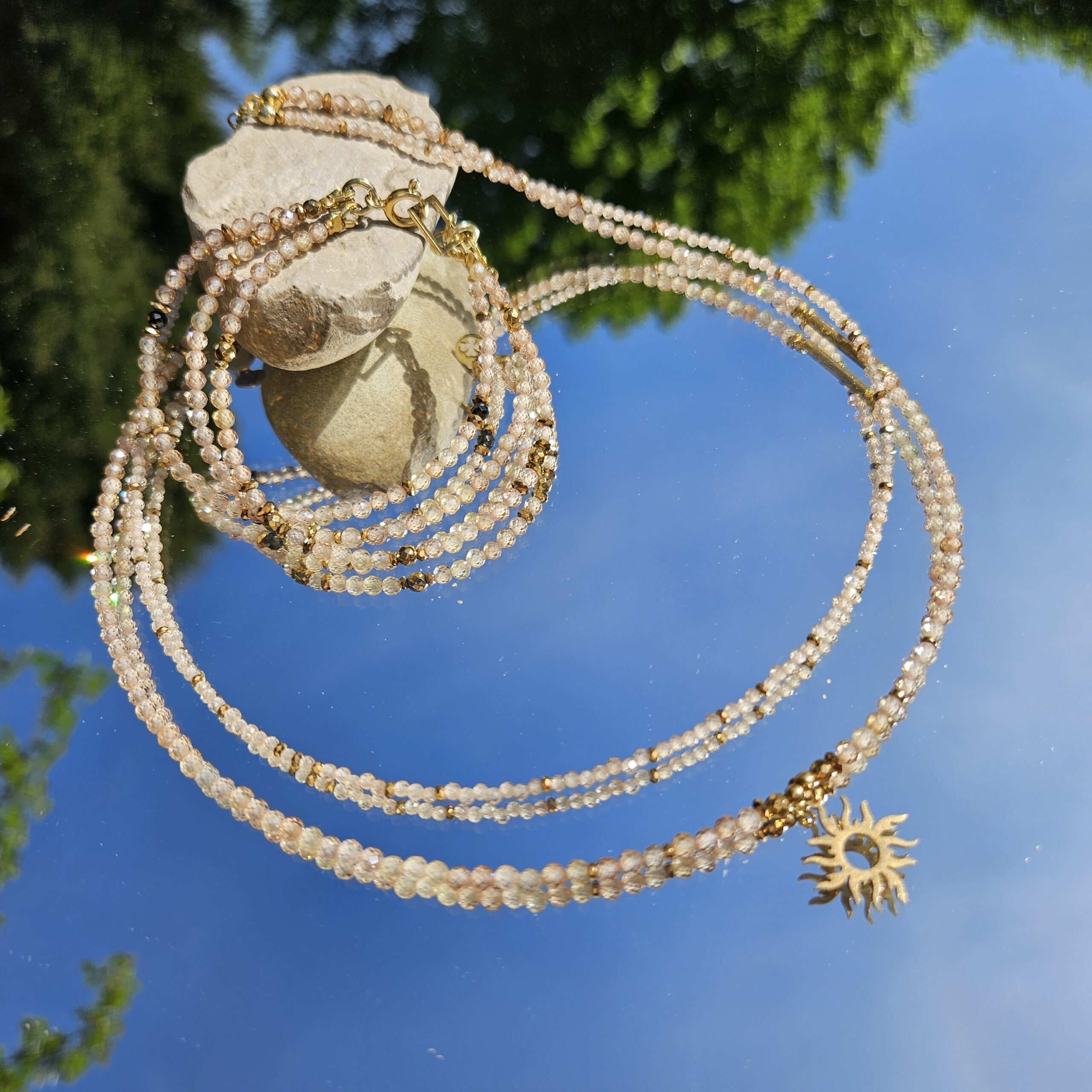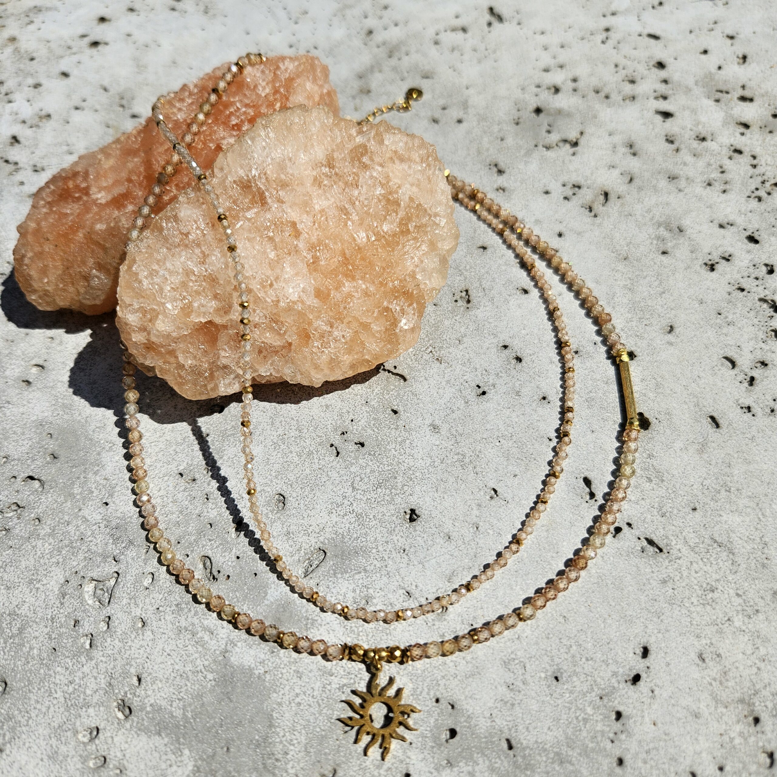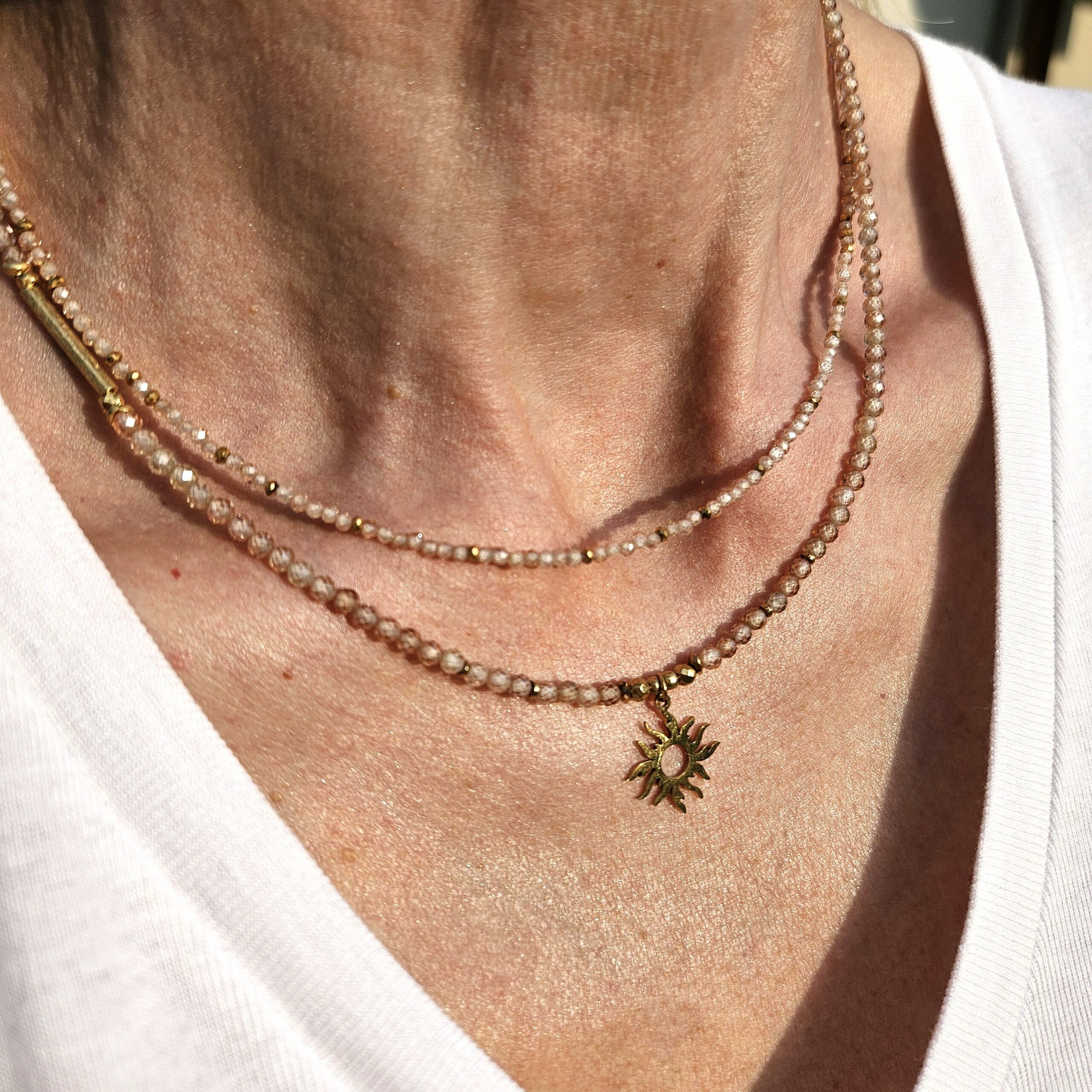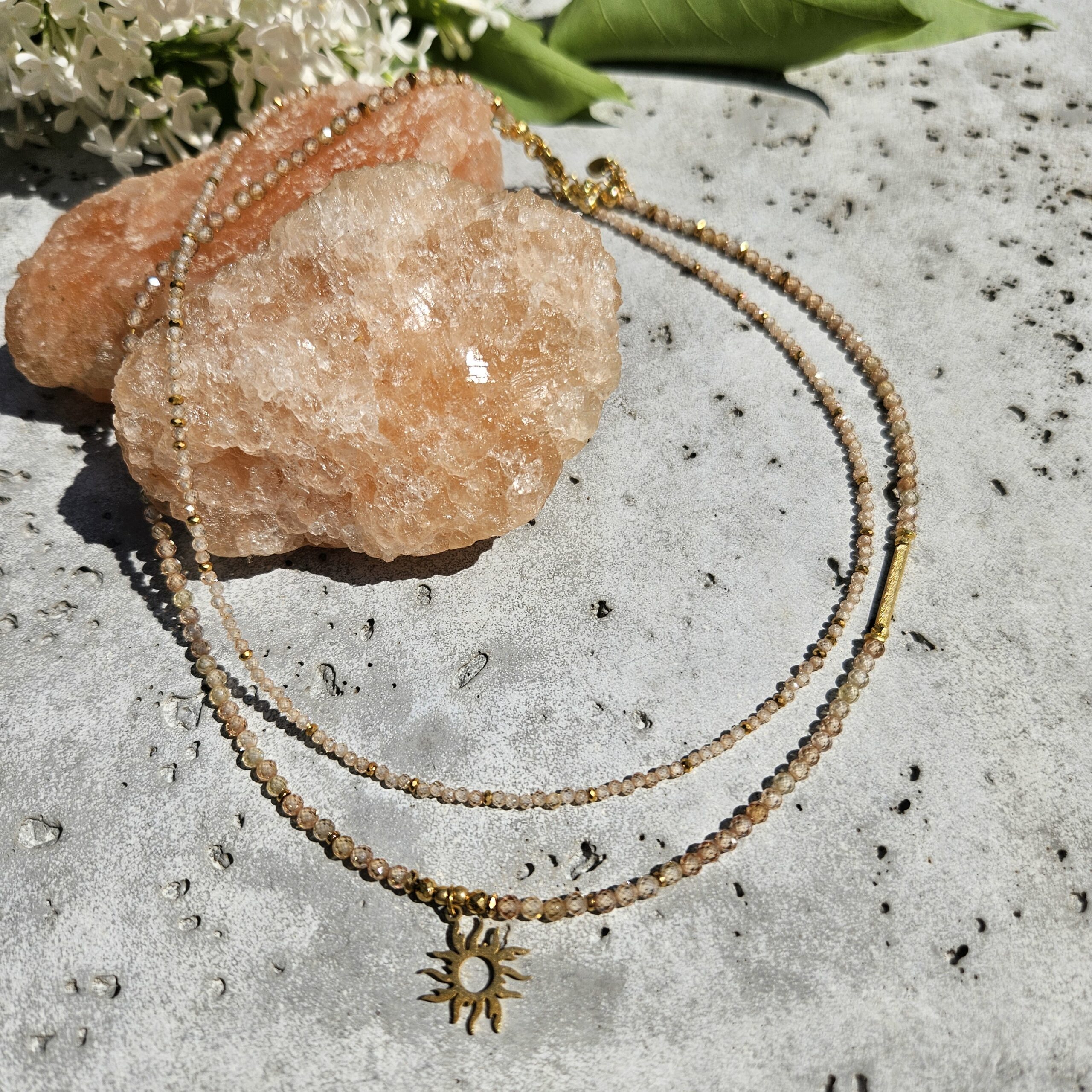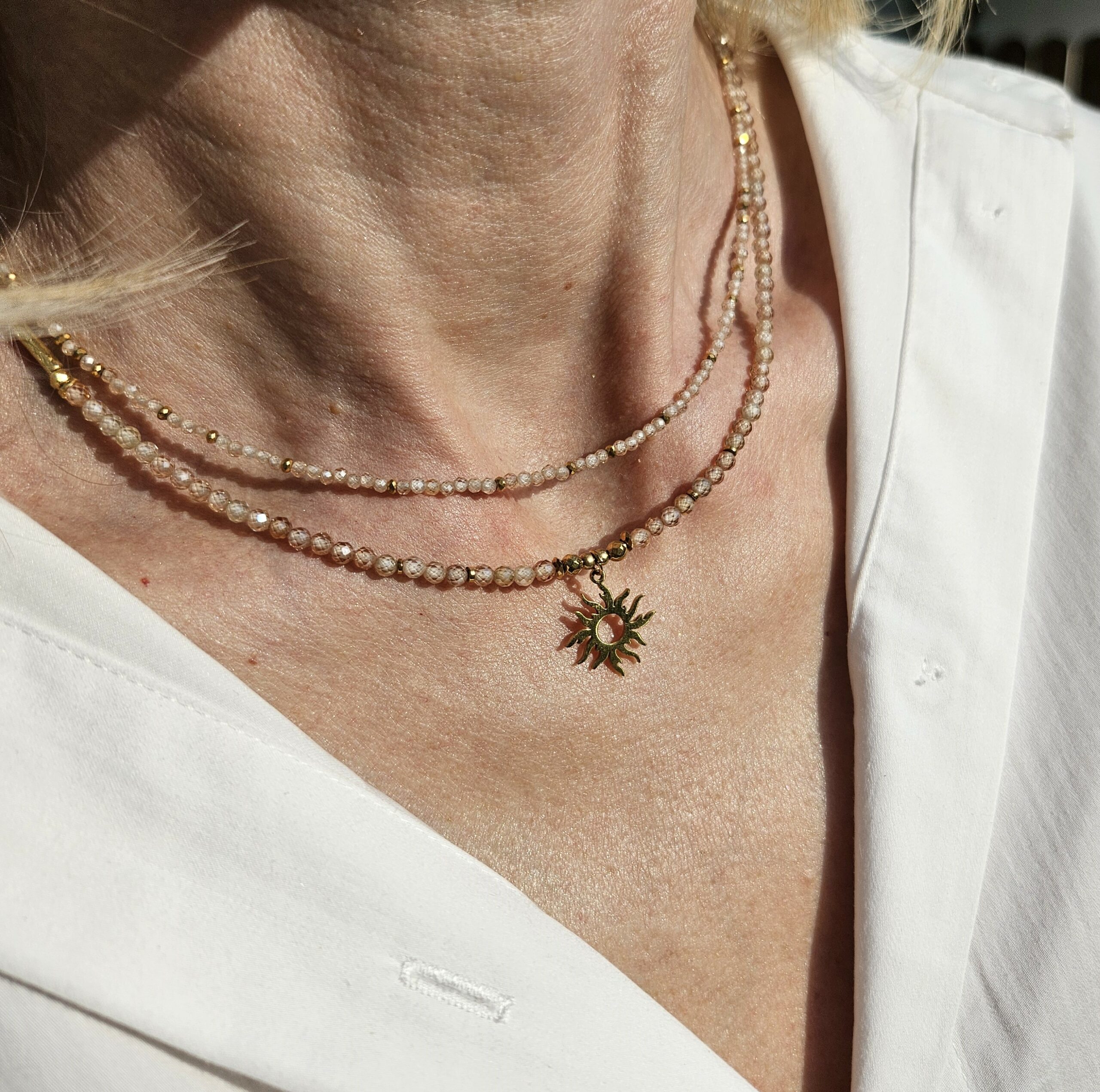 Naszyjnik jest wykonany ręcznie z cyrkonii w kolorze szampańskim. Model ten jest podwójny z 2 i 3 mm cyrkonii oraz z hematytów o długości 39,5 cm plus 5 cm łańcuszka. Posiada zawieszkę o średnicy 1,5 cm i elementy dekoracyjne ze srebra najwyższej próby pozłacanego 24 k złotem.