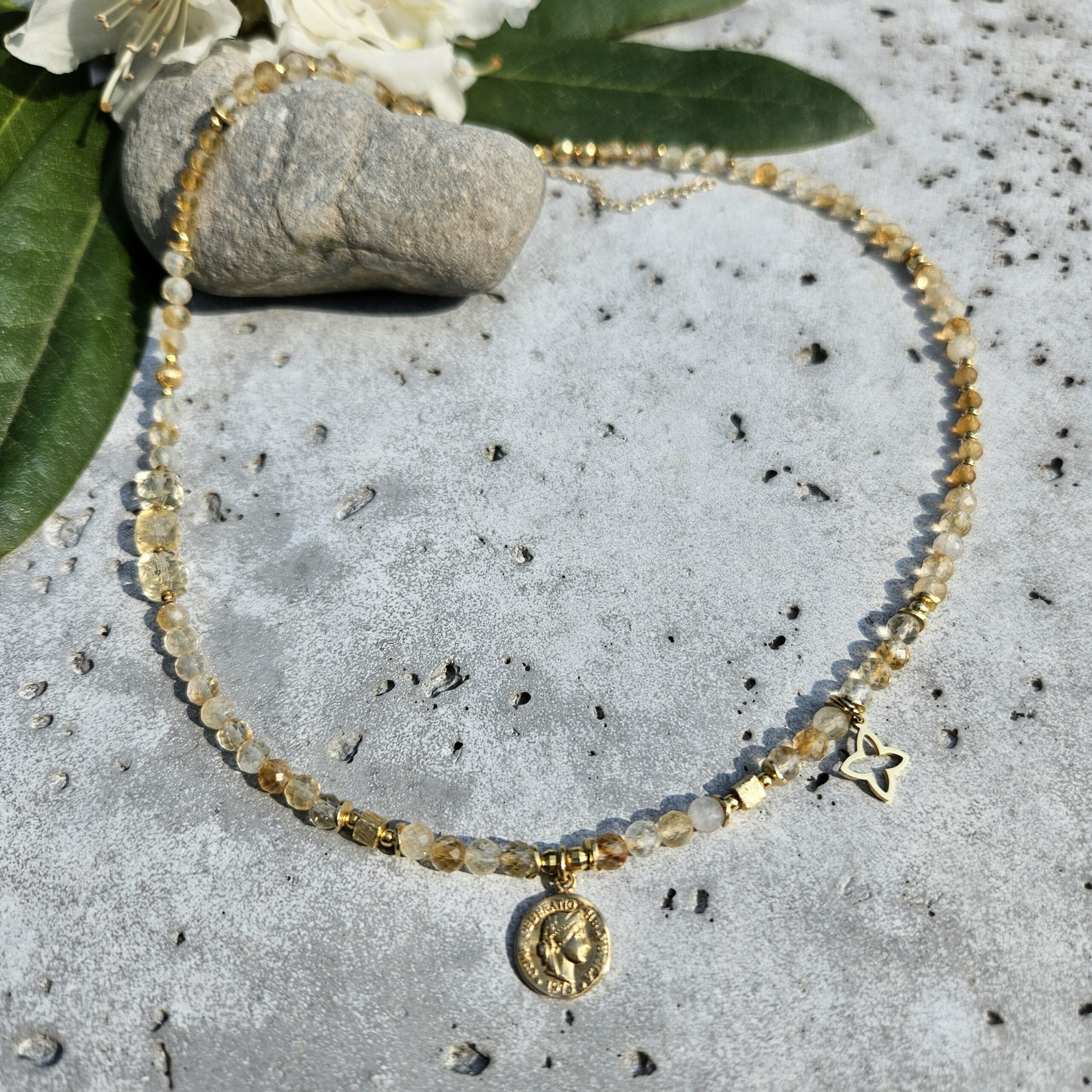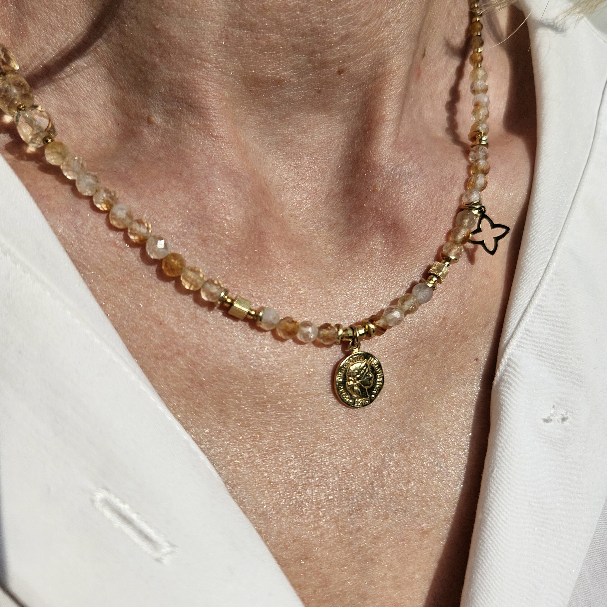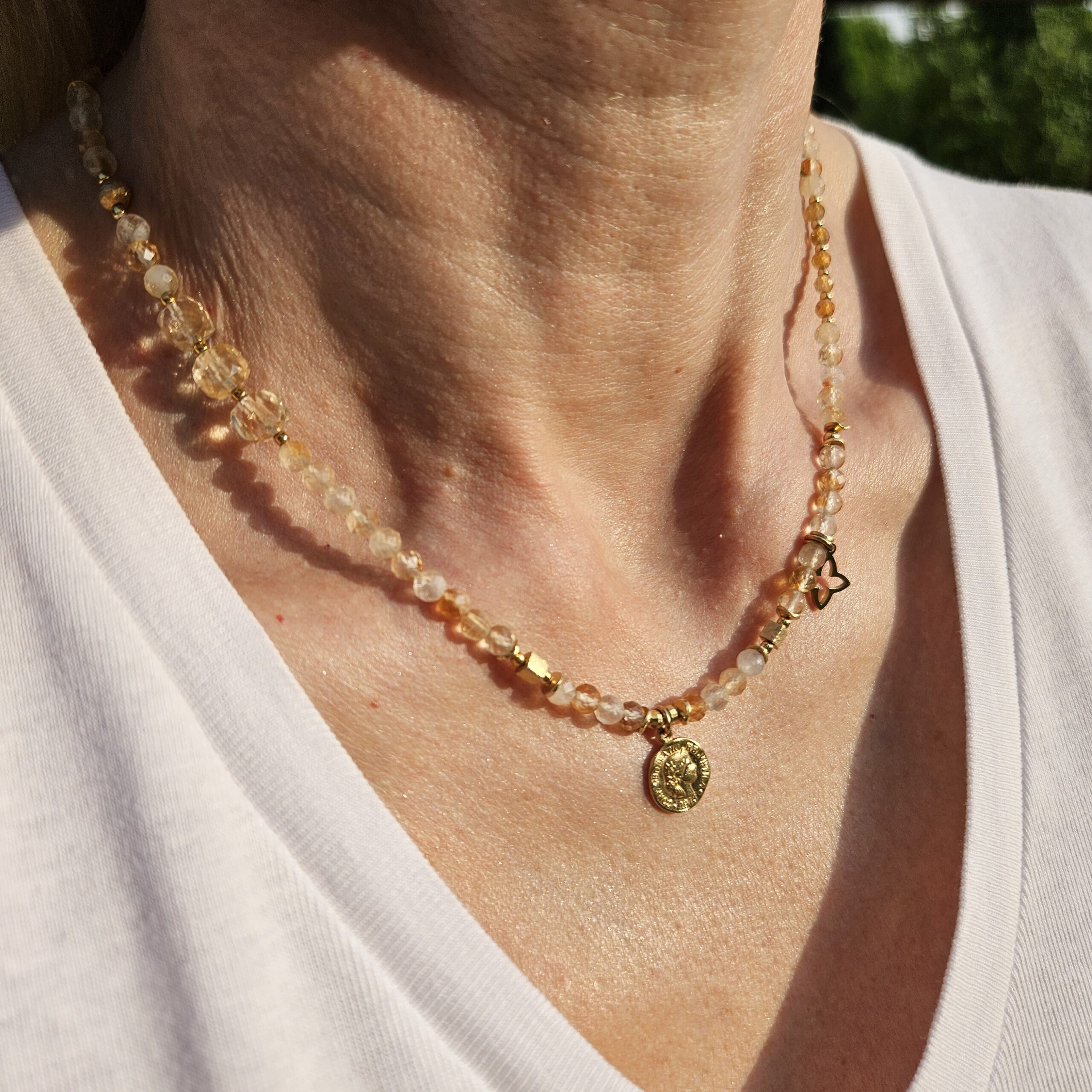 Naszyjnik jest wykonany ręcznie z naturalnych, różnej wielkości kamieni cytrynu, od 2 do 6 mm. Model ten jest długości 43,5 cm plus 5 cm łańcuszka. Posiada zawieszkę monetkę o średnicy 1 cm i elementy dekoracyjne ze srebra najwyższej próby pozłacanego 24 k złotem.