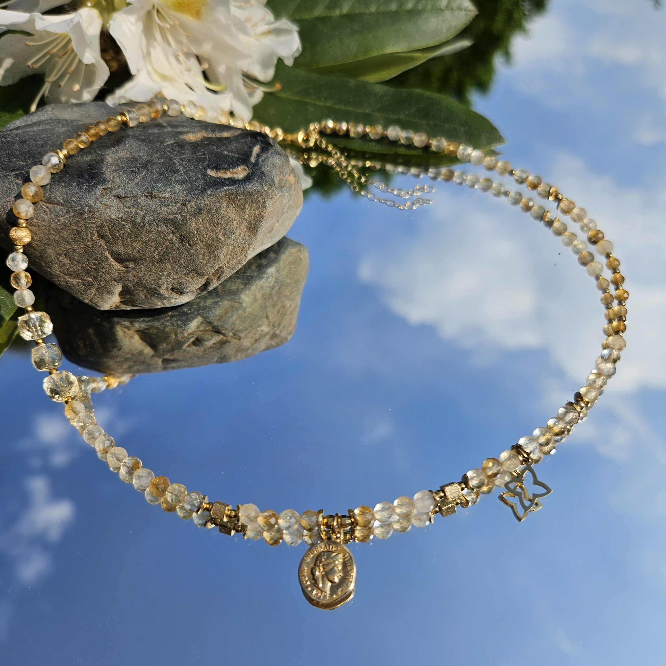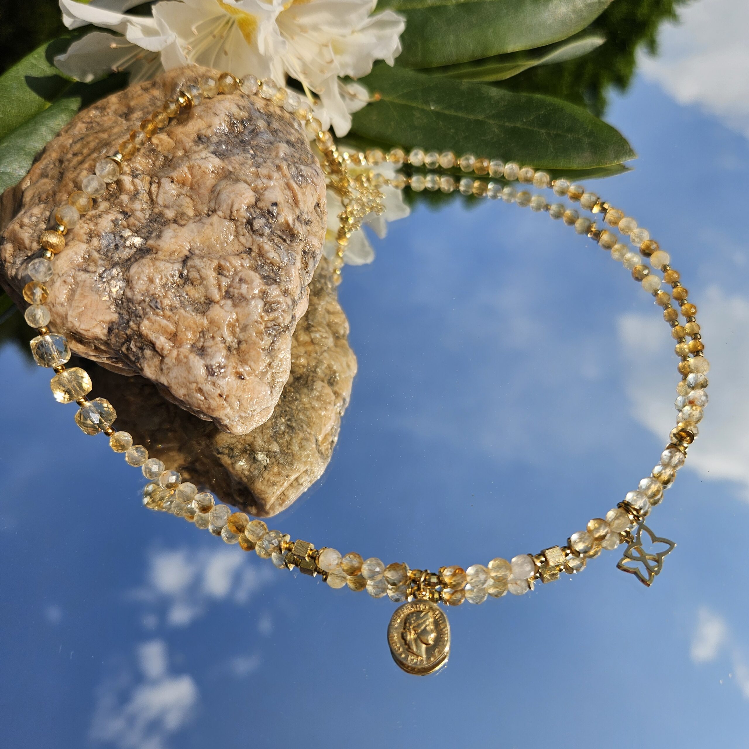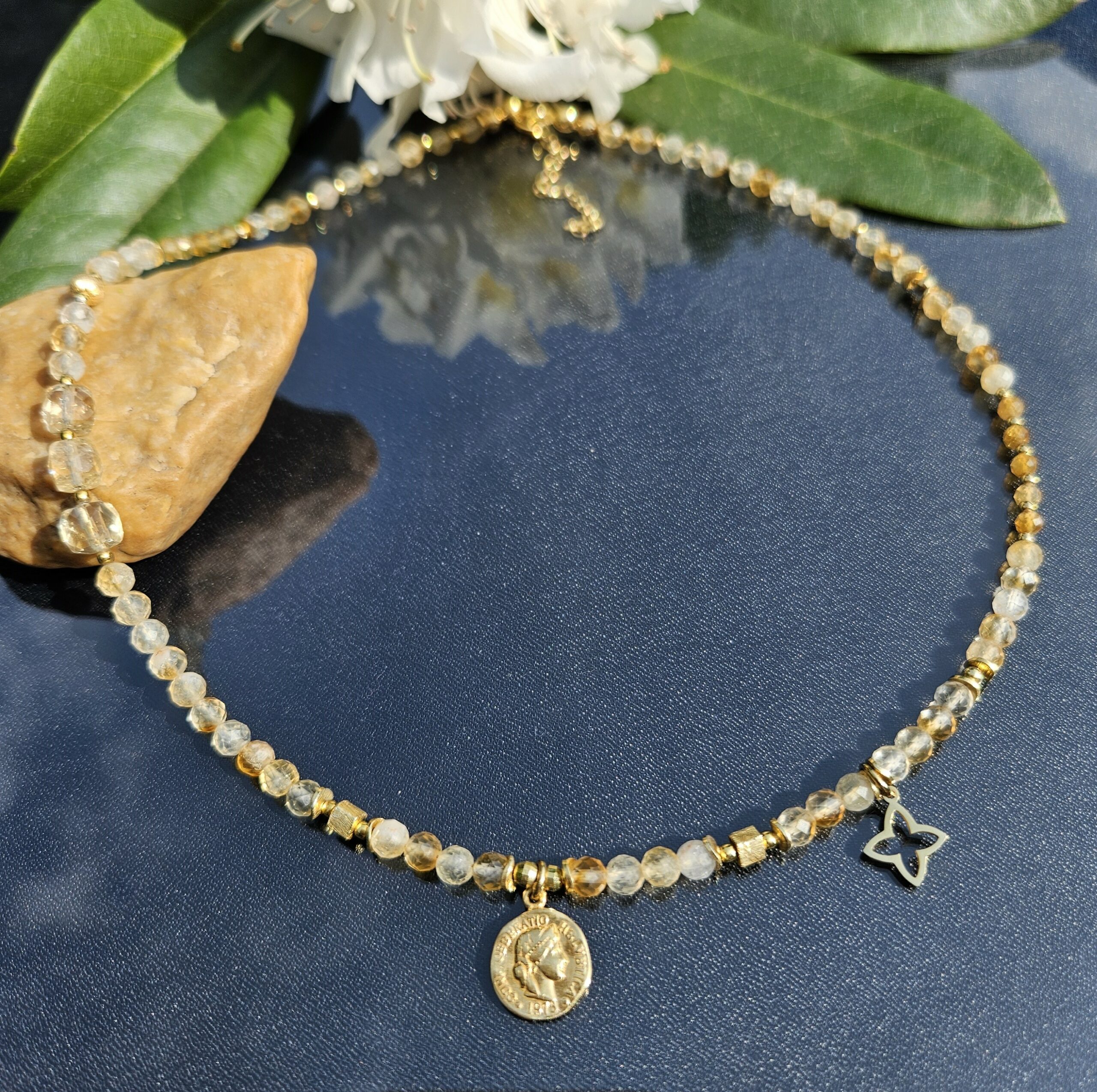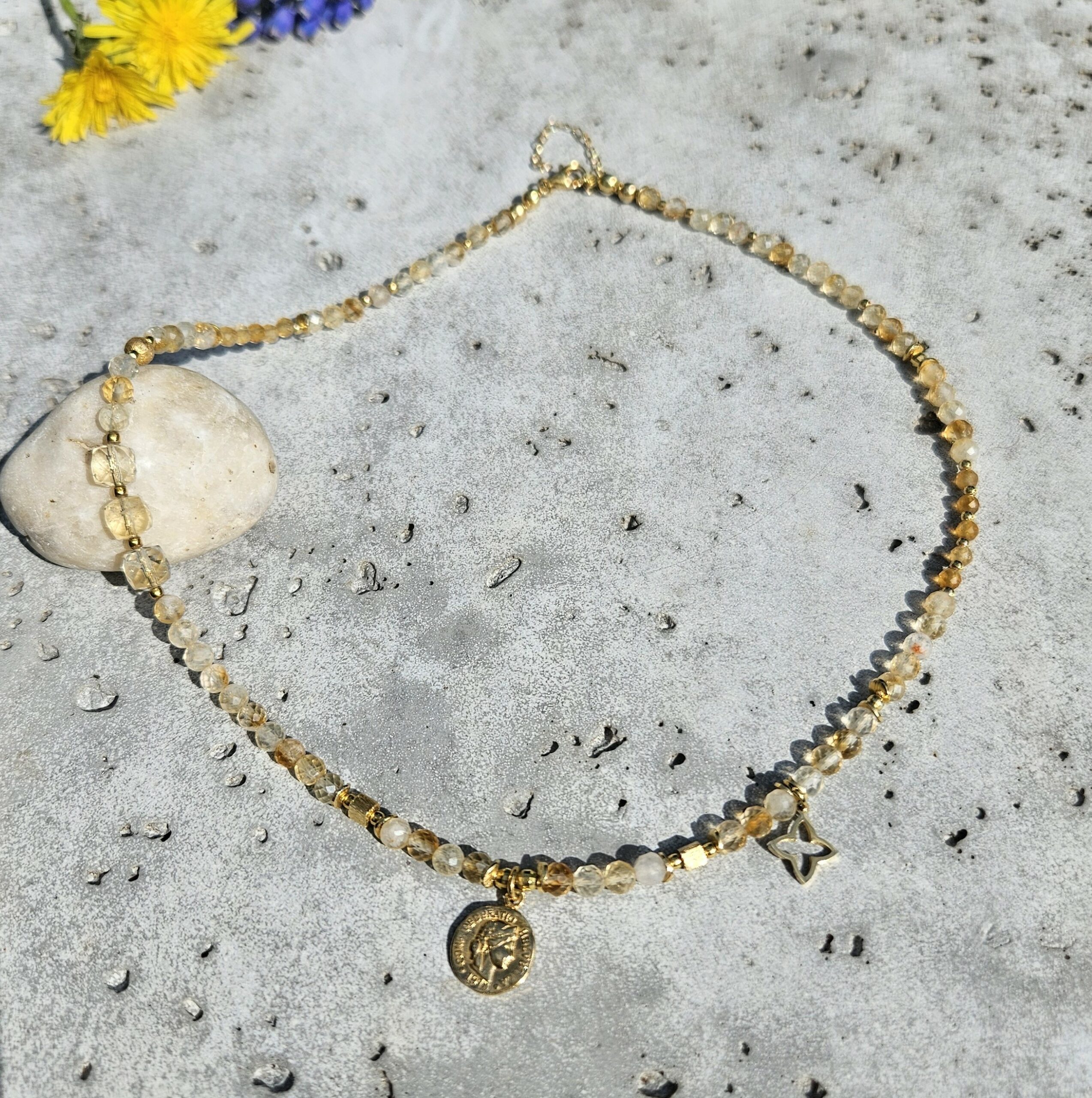 Naszyjnik jest wykonany ręcznie z naturalnych, różnej wielkości kamieni cytrynu, od 2 do 6 mm. Model ten jest długości 43,5 cm plus 5 cm łańcuszka. Posiada zawieszkę monetkę o średnicy 1 cm i elementy dekoracyjne ze srebra najwyższej próby pozłacanego 24 k złotem.