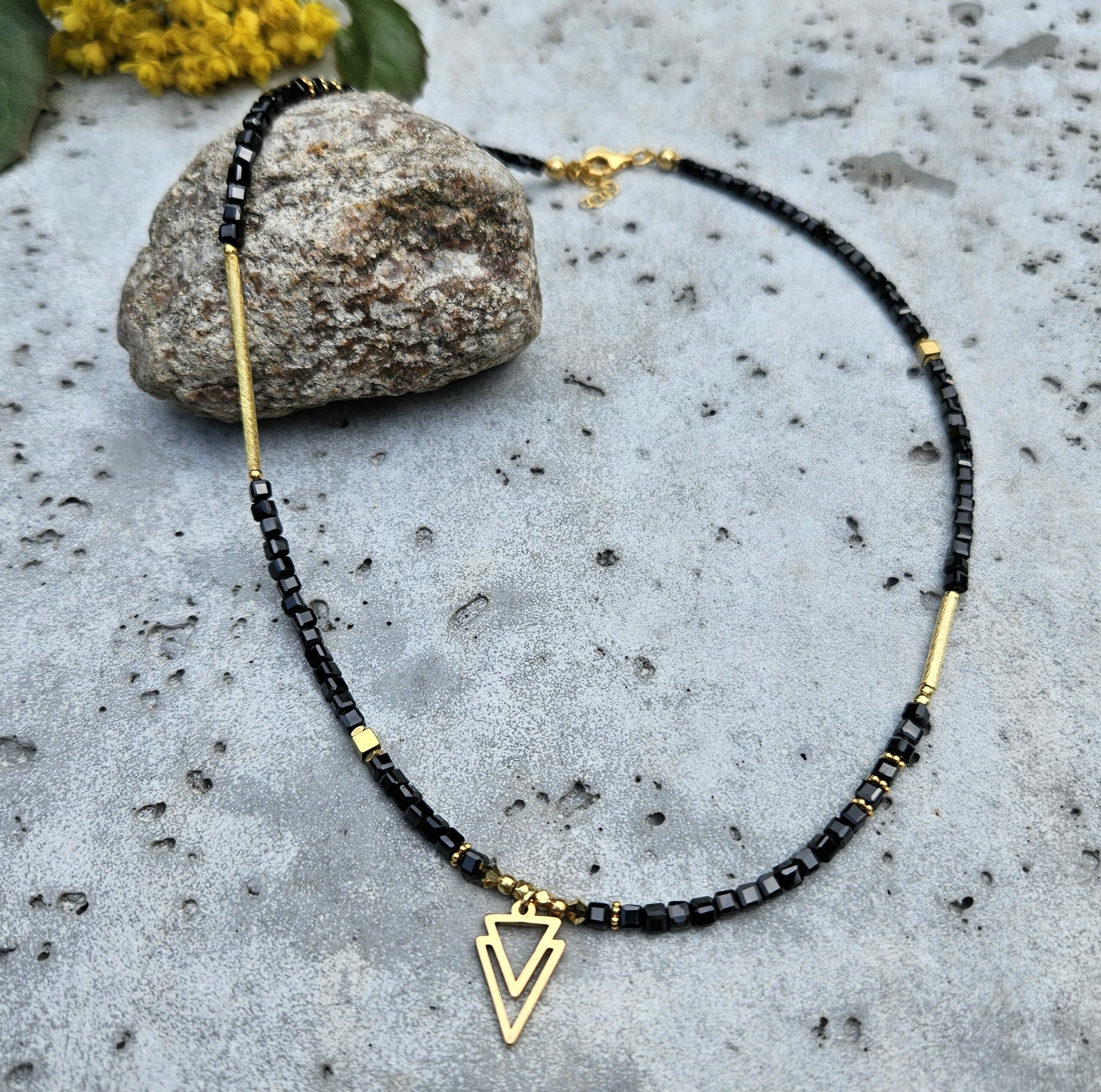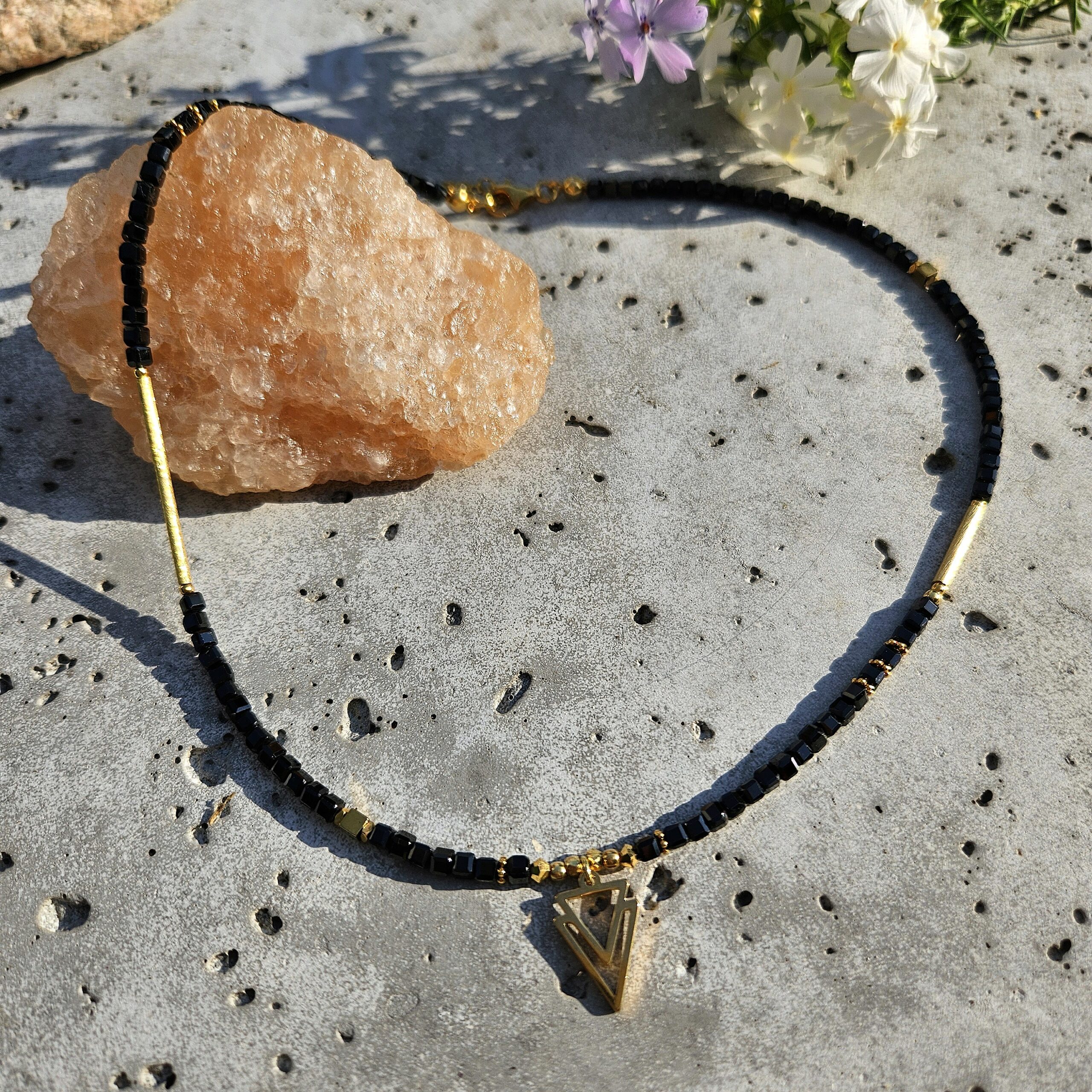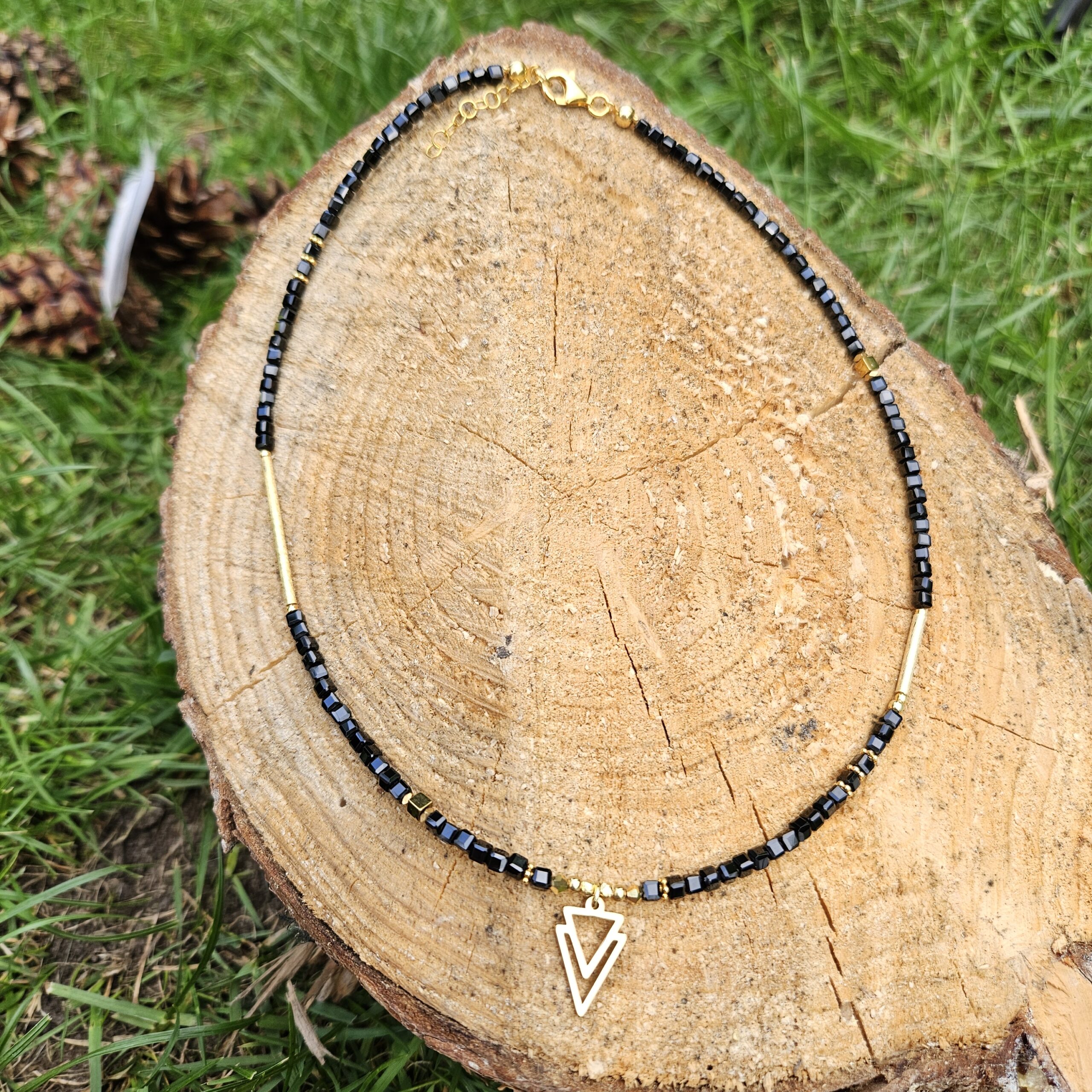 Naszyjnik jest wykonany ręcznie z czarnego hematytu w kształcie kostki 3 mm. Model ten jest długości 43 cm plus 2,5 cm łańcuszka. Posiada zawieszkę o wymiarach 1 x 1,5 cm i elementy dekoracyjne ze srebra najwyższej próby pozłacanego 24 k złotem oraz z hematytu.
