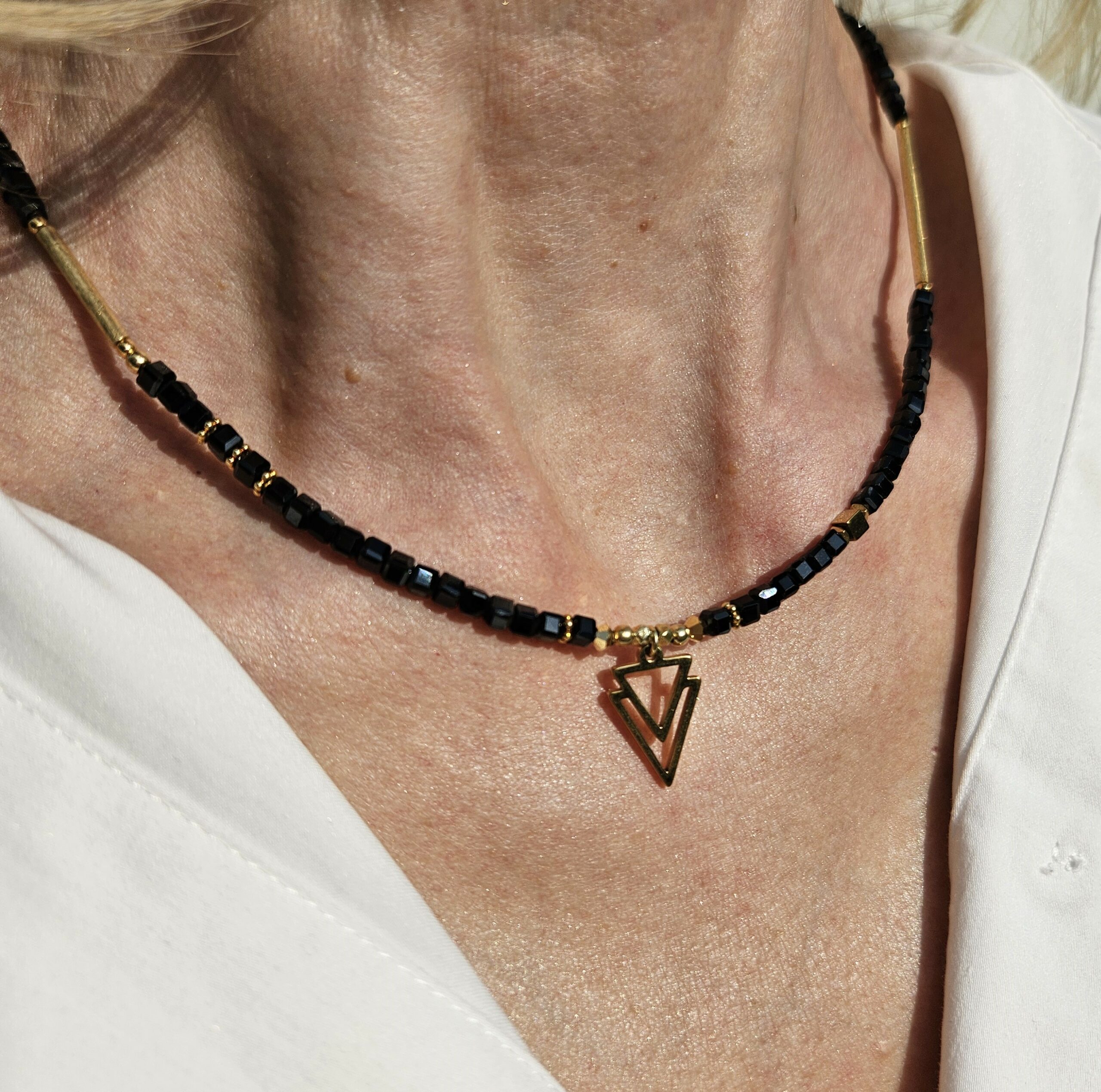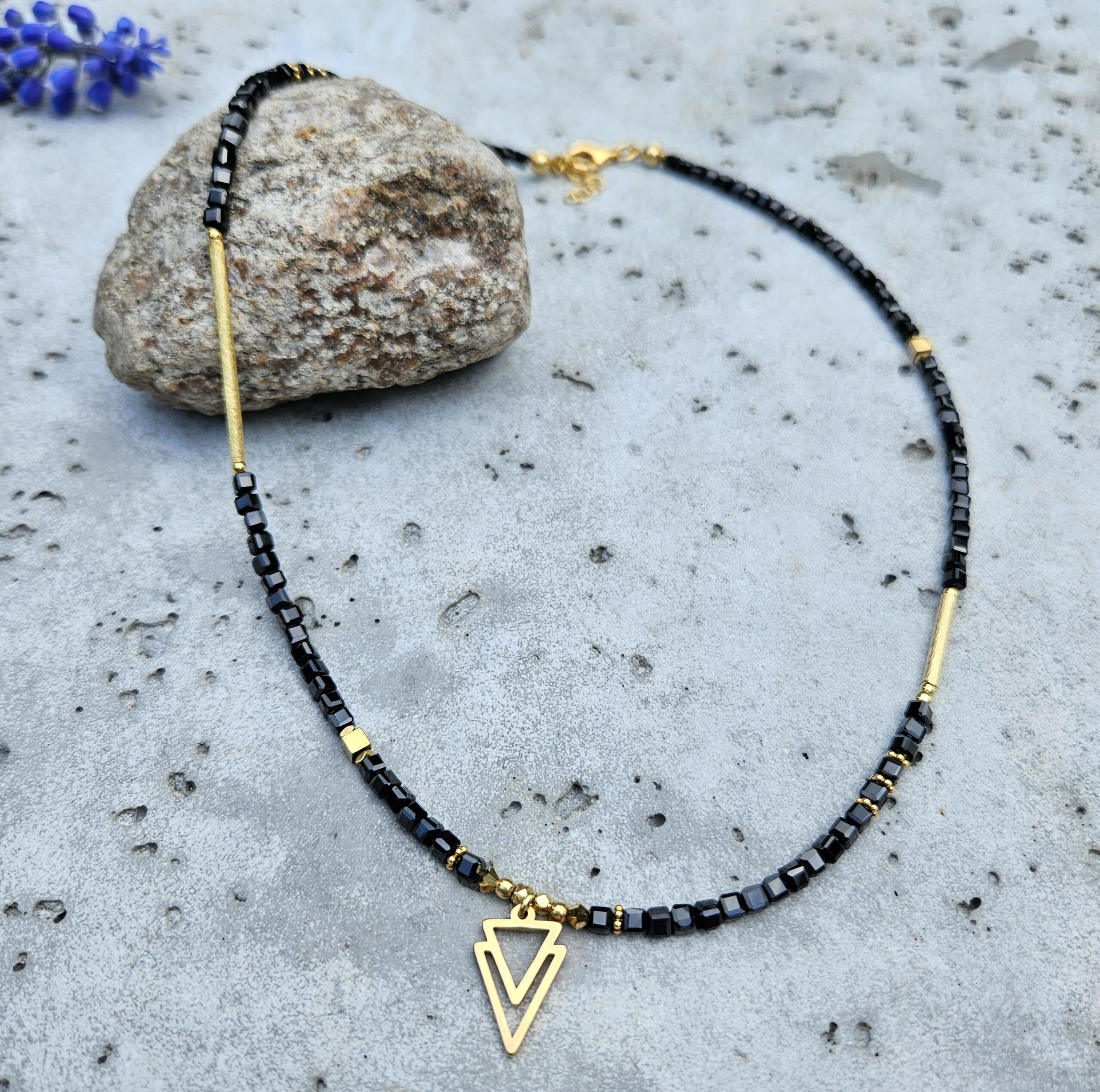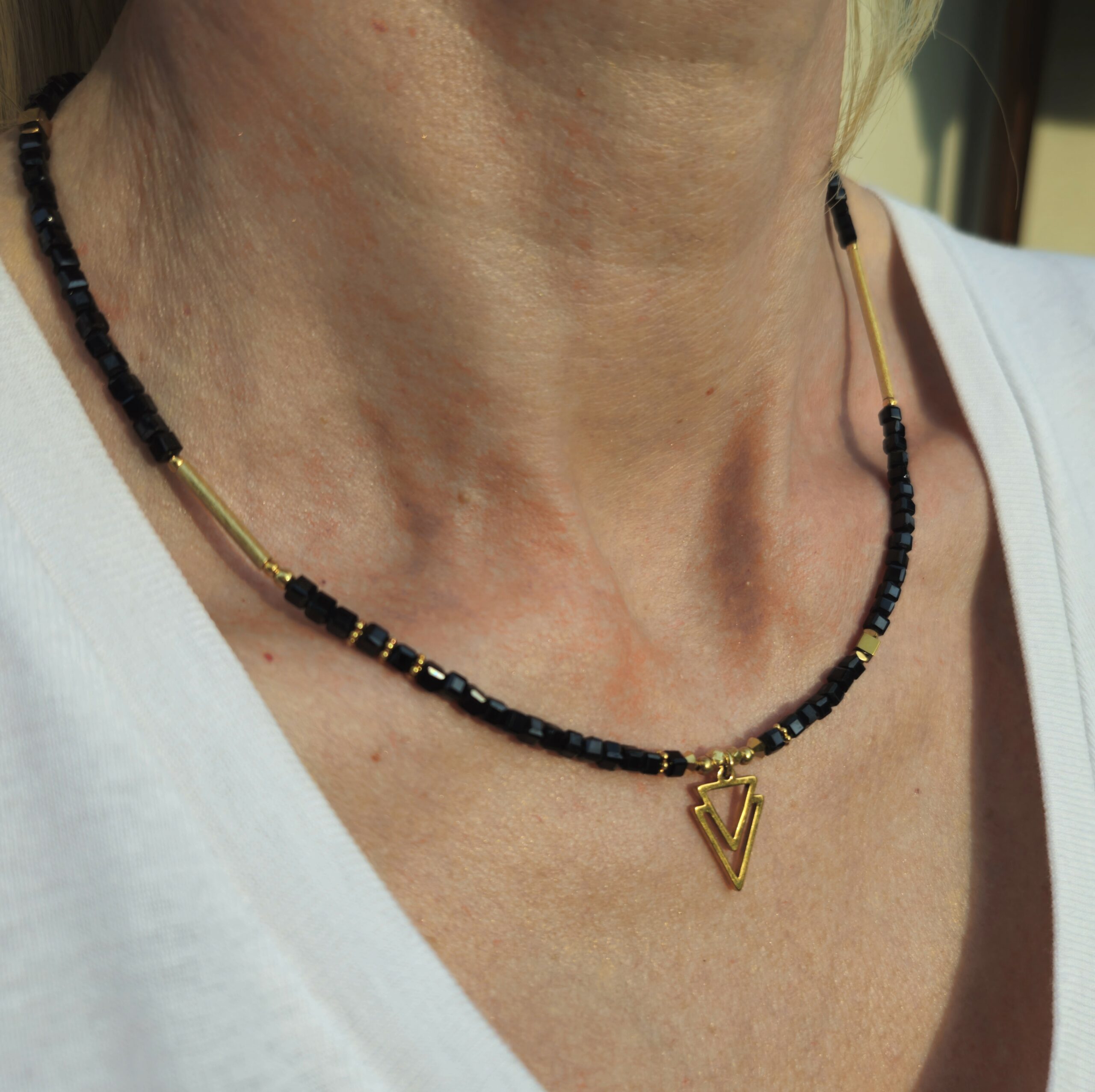 Naszyjnik jest wykonany ręcznie z czarnego hematytu w kształcie kostki 3 mm. Model ten jest długości 43 cm plus 2,5 cm łańcuszka. Posiada zawieszkę o wymiarach 1 x 1,5 cm i elementy dekoracyjne ze srebra najwyższej próby pozłacanego 24 k złotem oraz z hematytu.