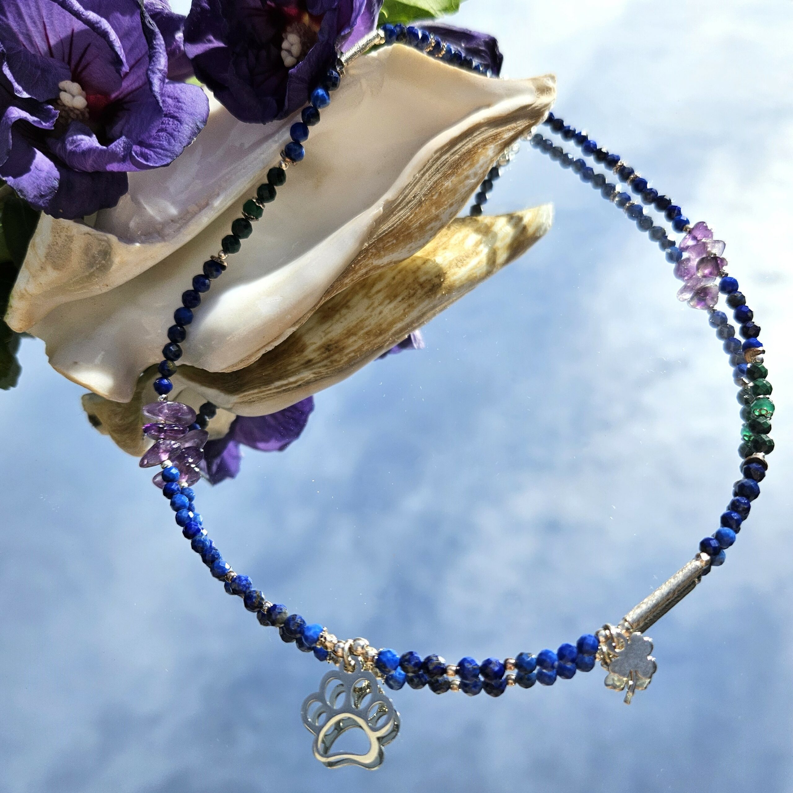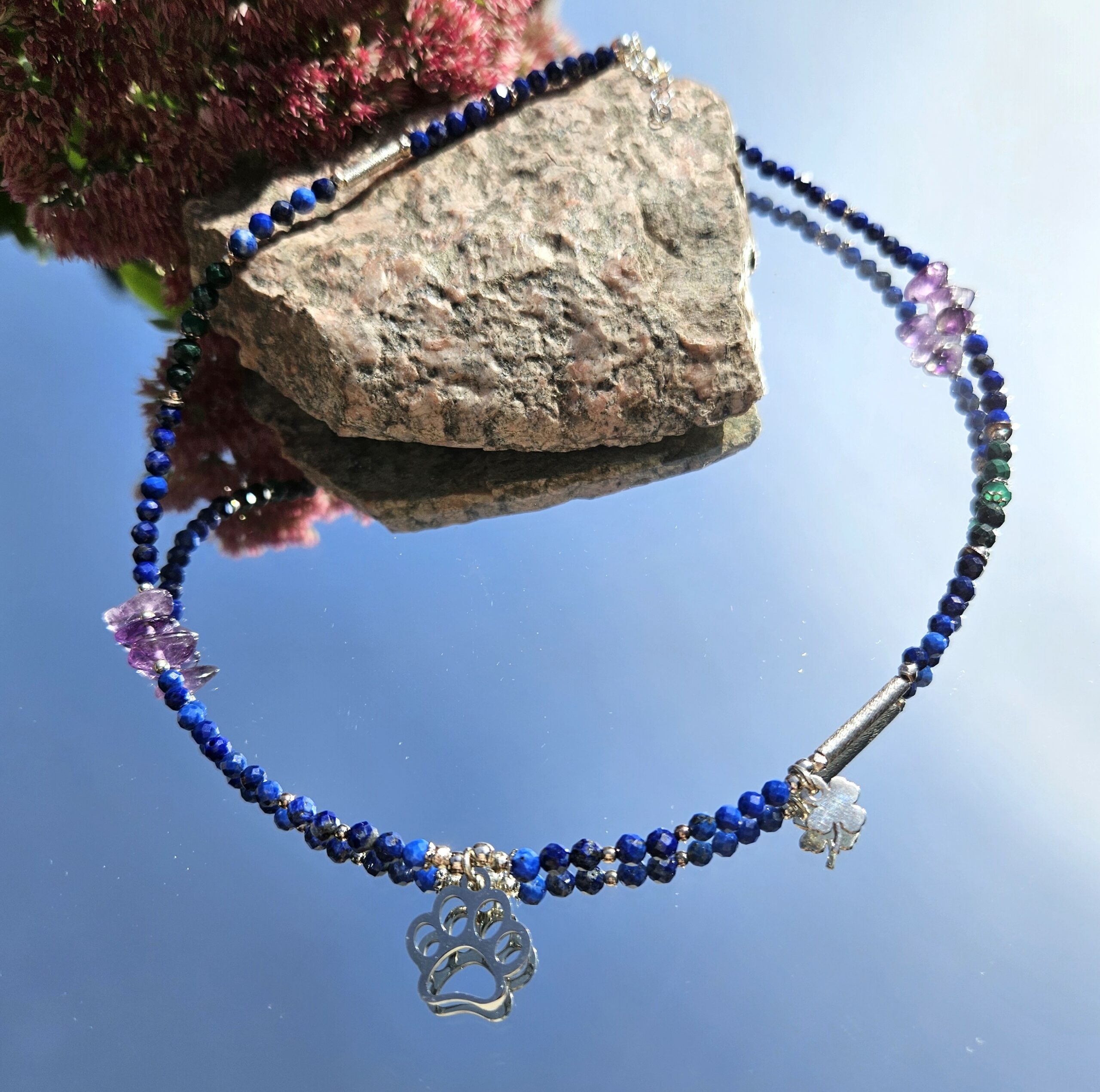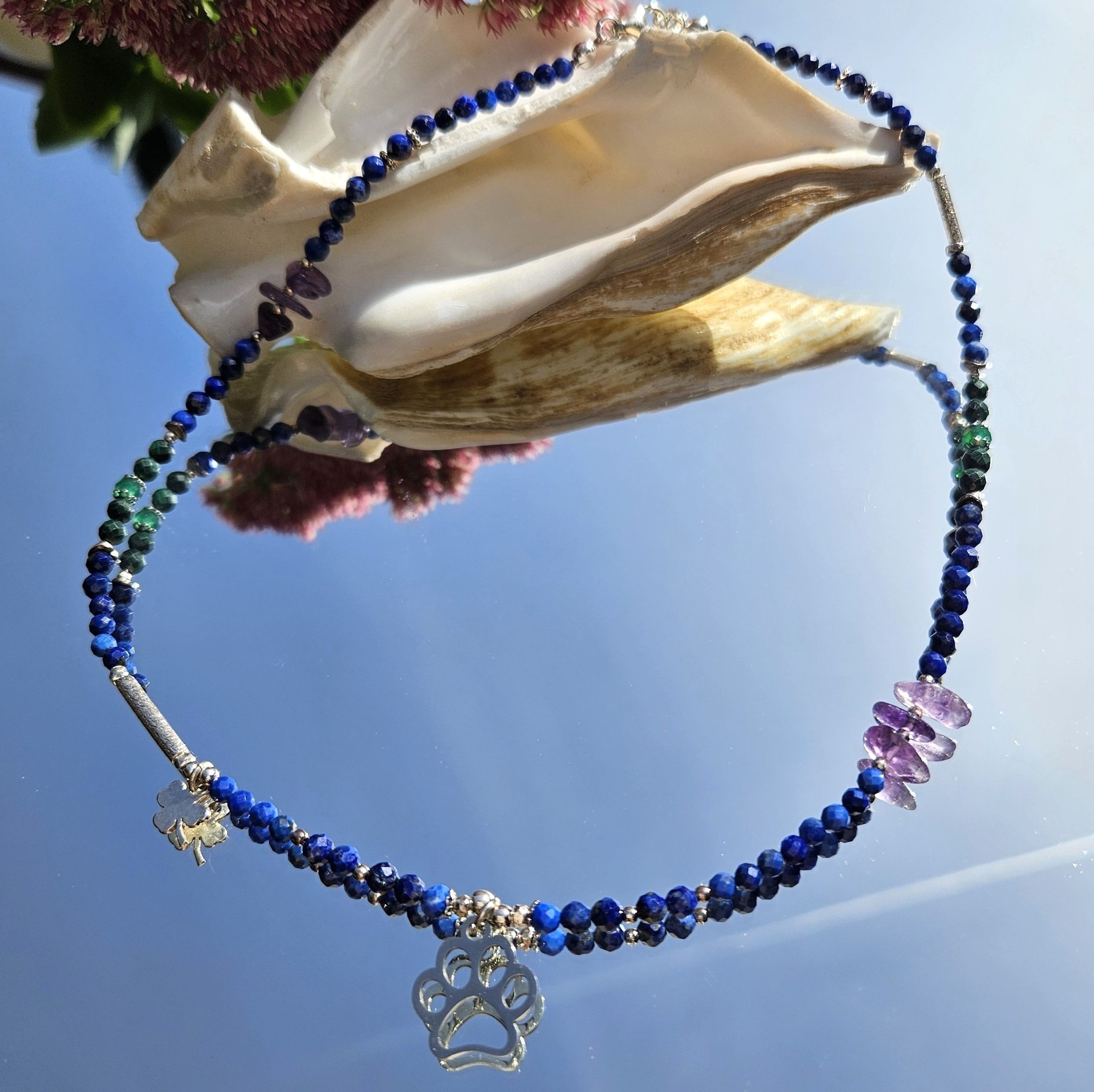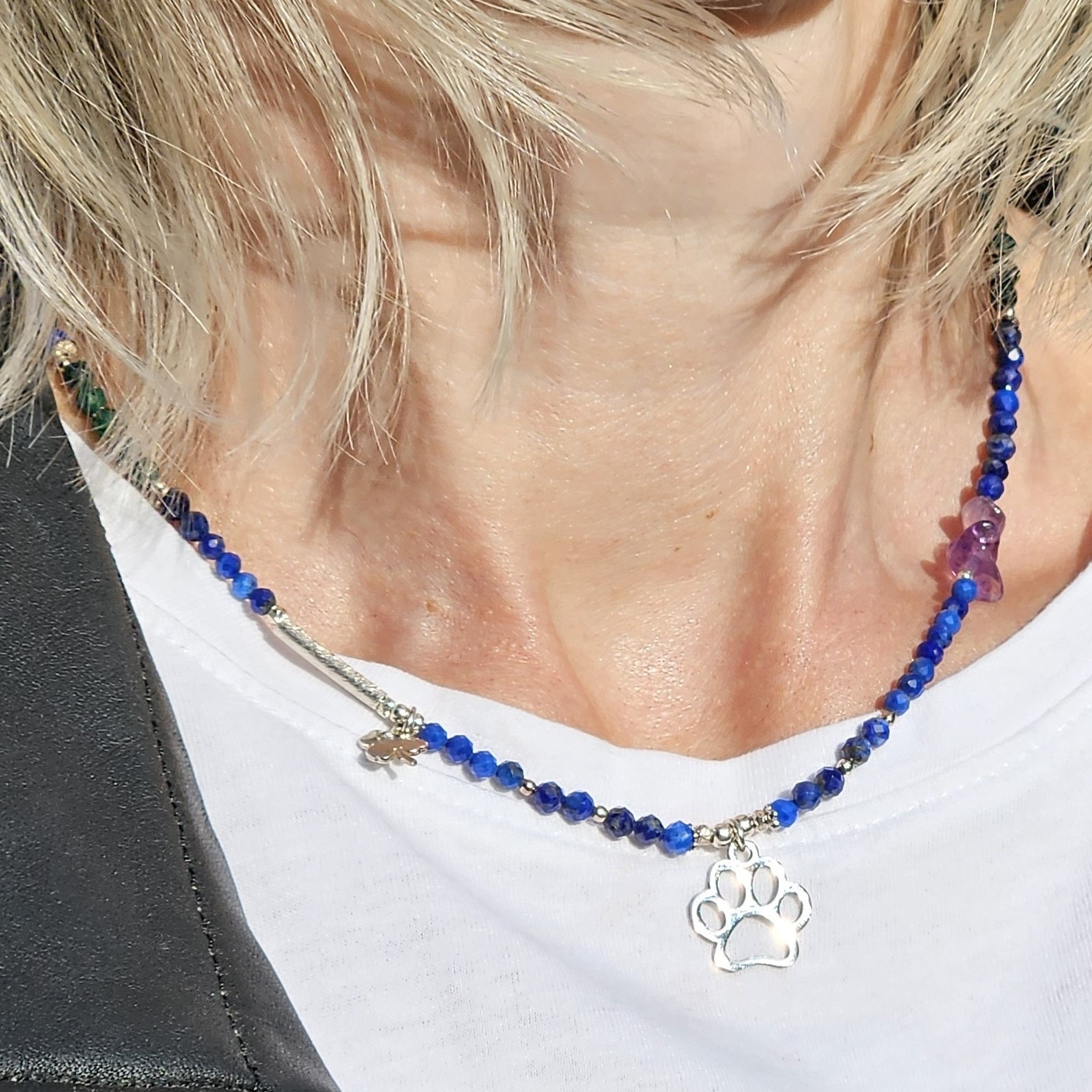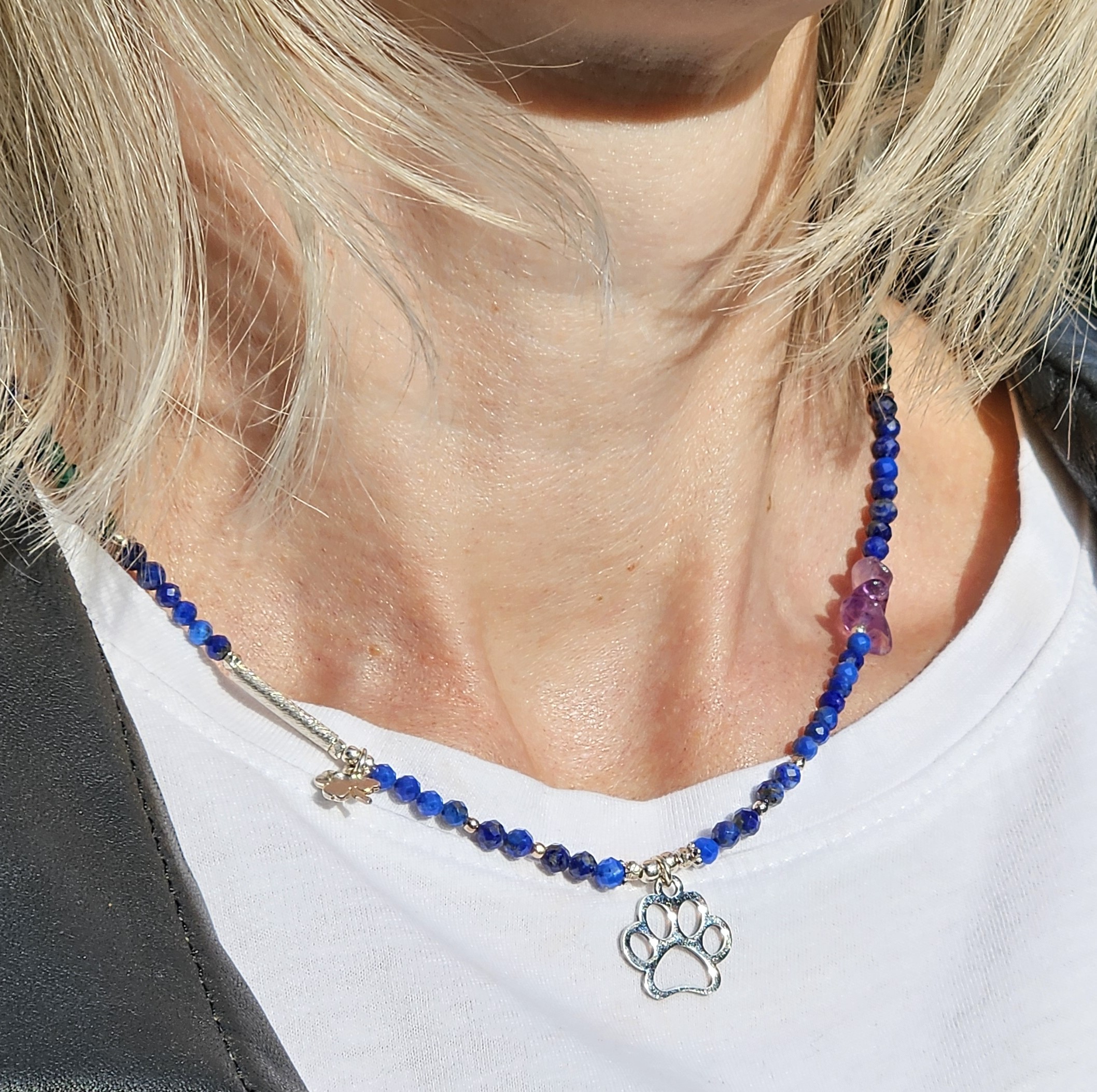 Naszyjnik jest wykonany ręcznie z naturalnych, kamieni lapis lazuli, agatu o wymiarach 4 mm i nieregularnego ametystu. Model ten jest długości 42 cm plus 3 cm ozdobnego łańcuszka. Posiada ażurową zawieszkę w kształcie psiej łapki o średnicy 1,5 cm i mniejszą zawieszkę w kształcie puzzla oraz elementy dekoracyjne ze srebra.