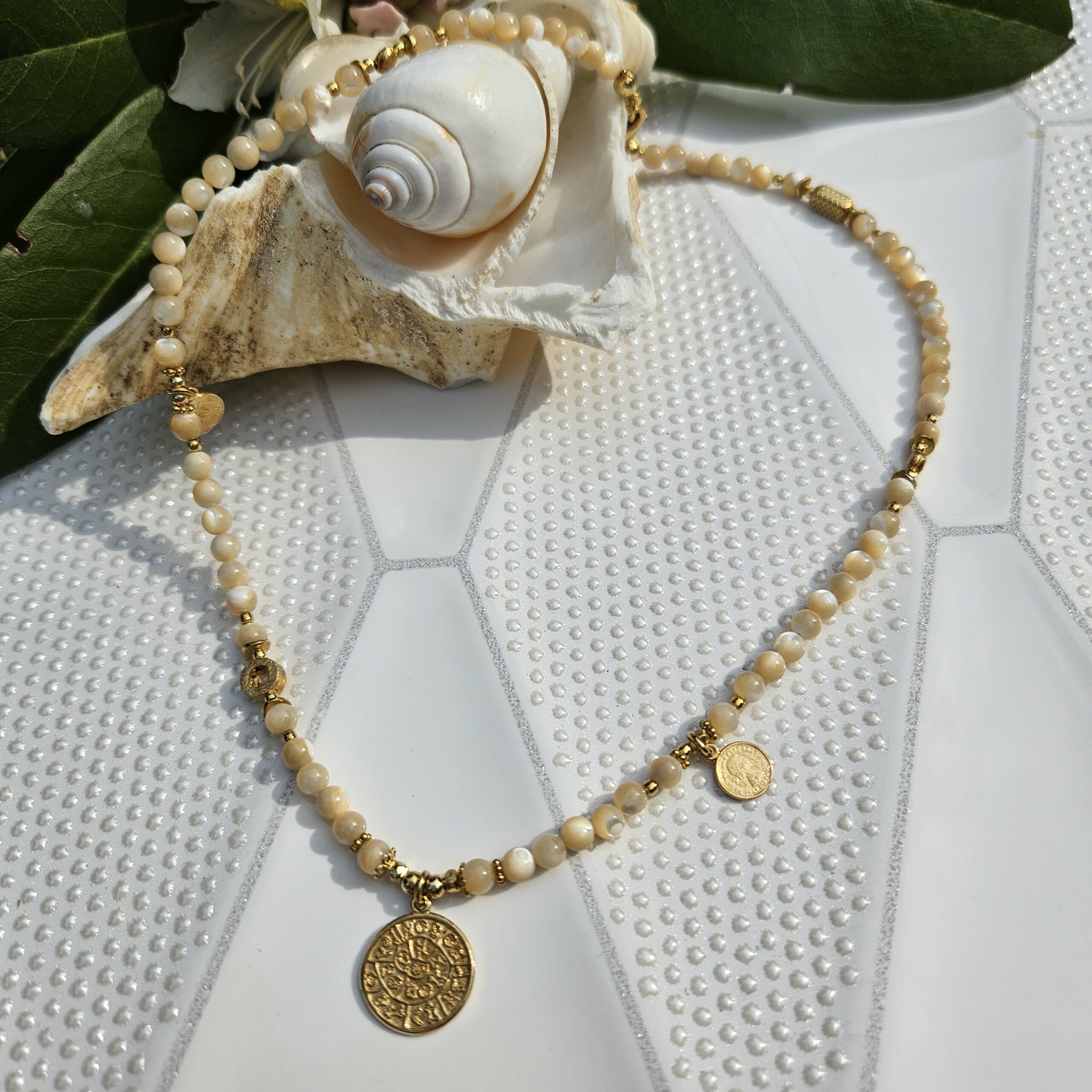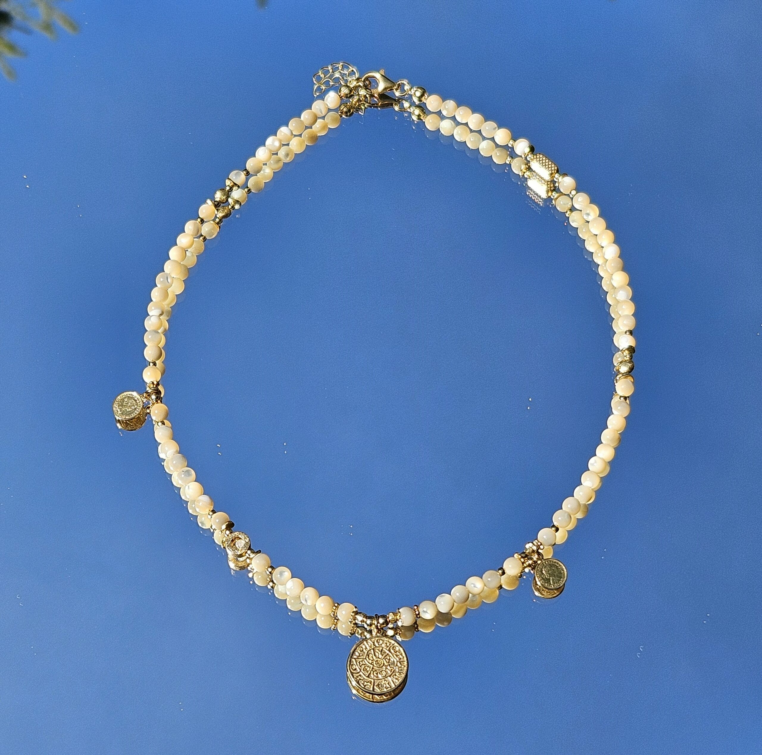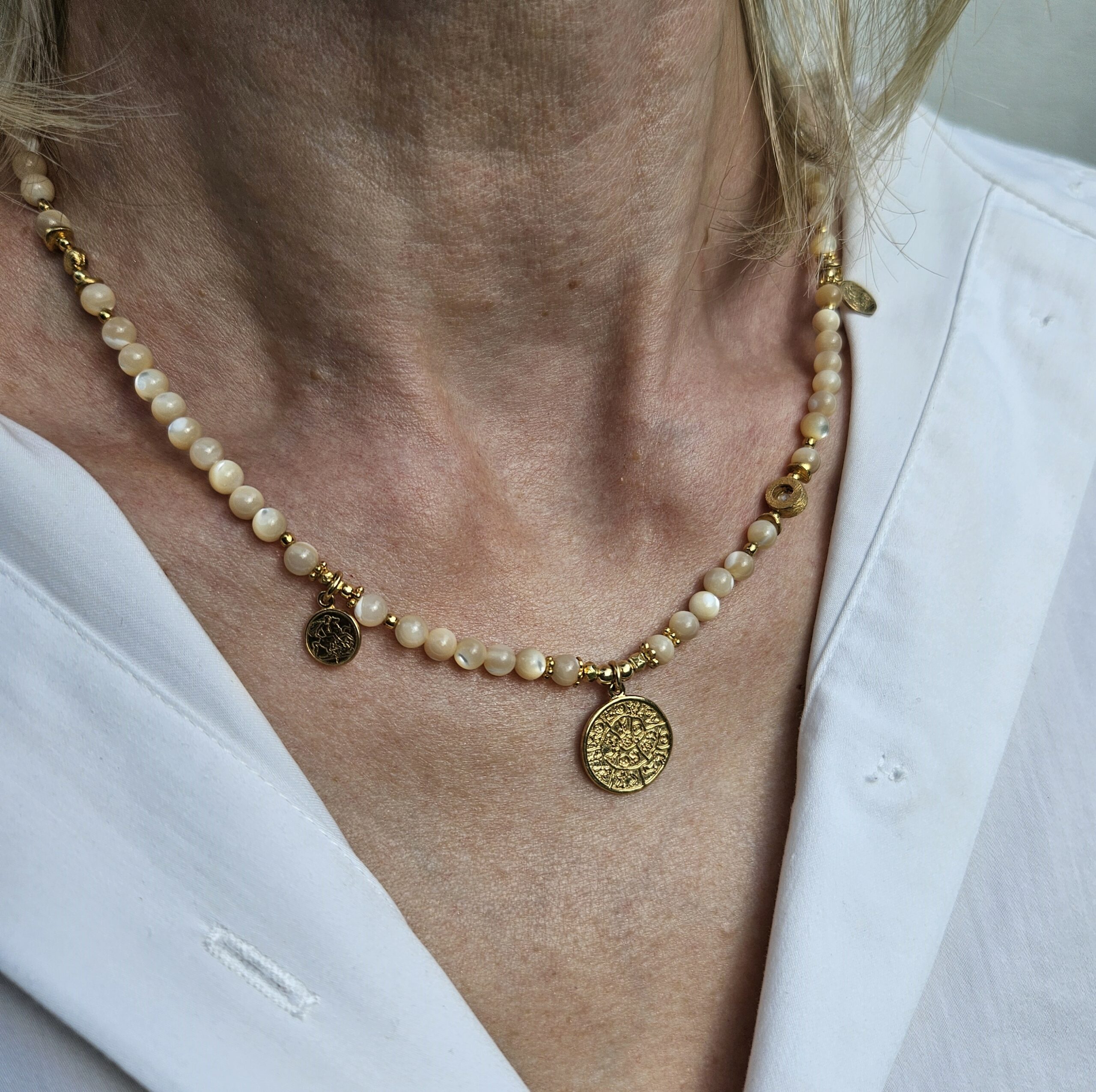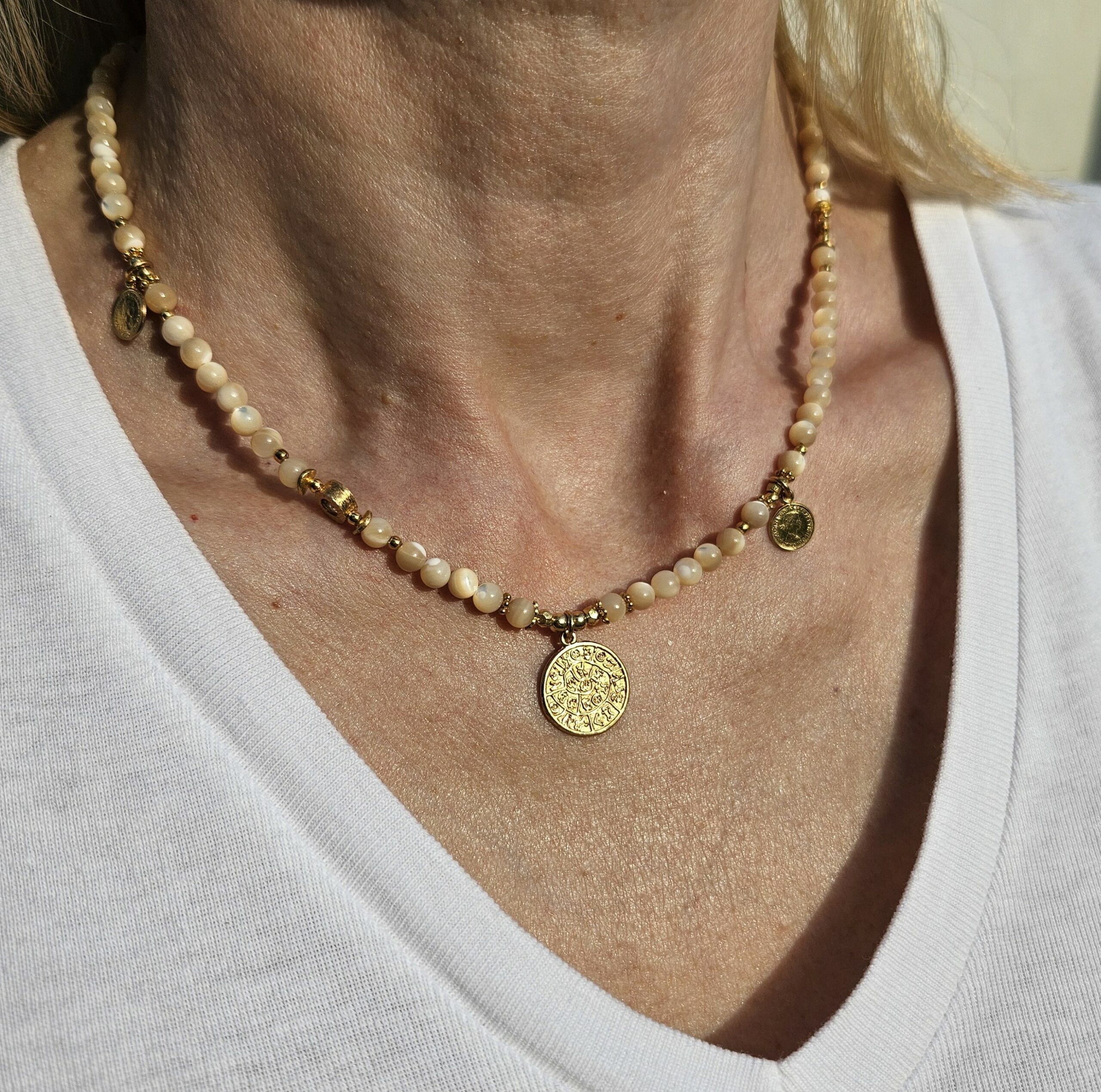 Naszyjnik jest wykonany ręcznie z kremowej masy perłowej o wielkości 4,5 mm. Model ten jest długości 42 cm plus 2,5 cm łańcuszka. Posiada zawieszkę monetkę o średnicy 1,5 cm i dwie małe monetki oraz elementy dekoracyjne ze srebra najwyższej próby pozłacanego 24 k złotem.