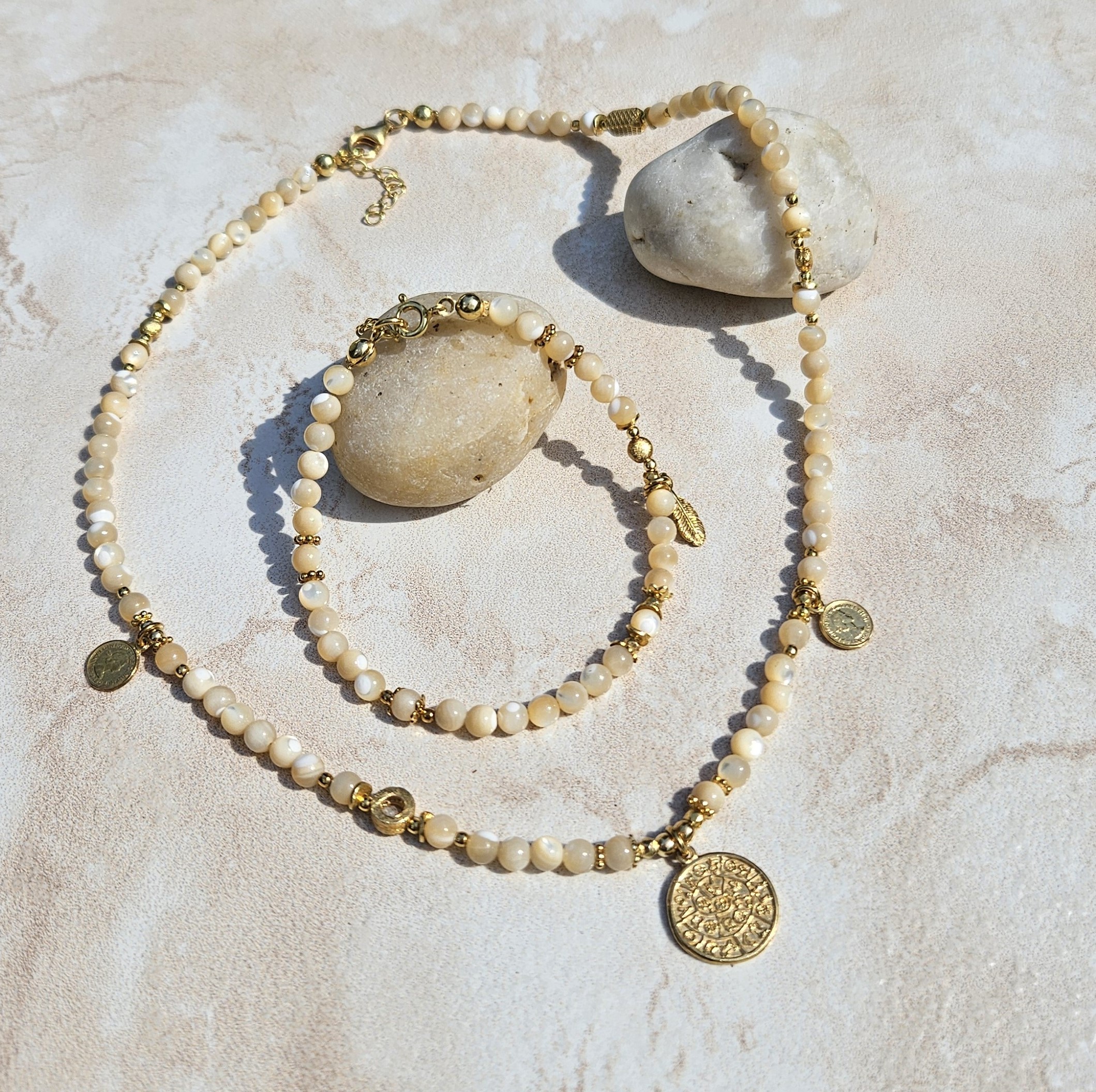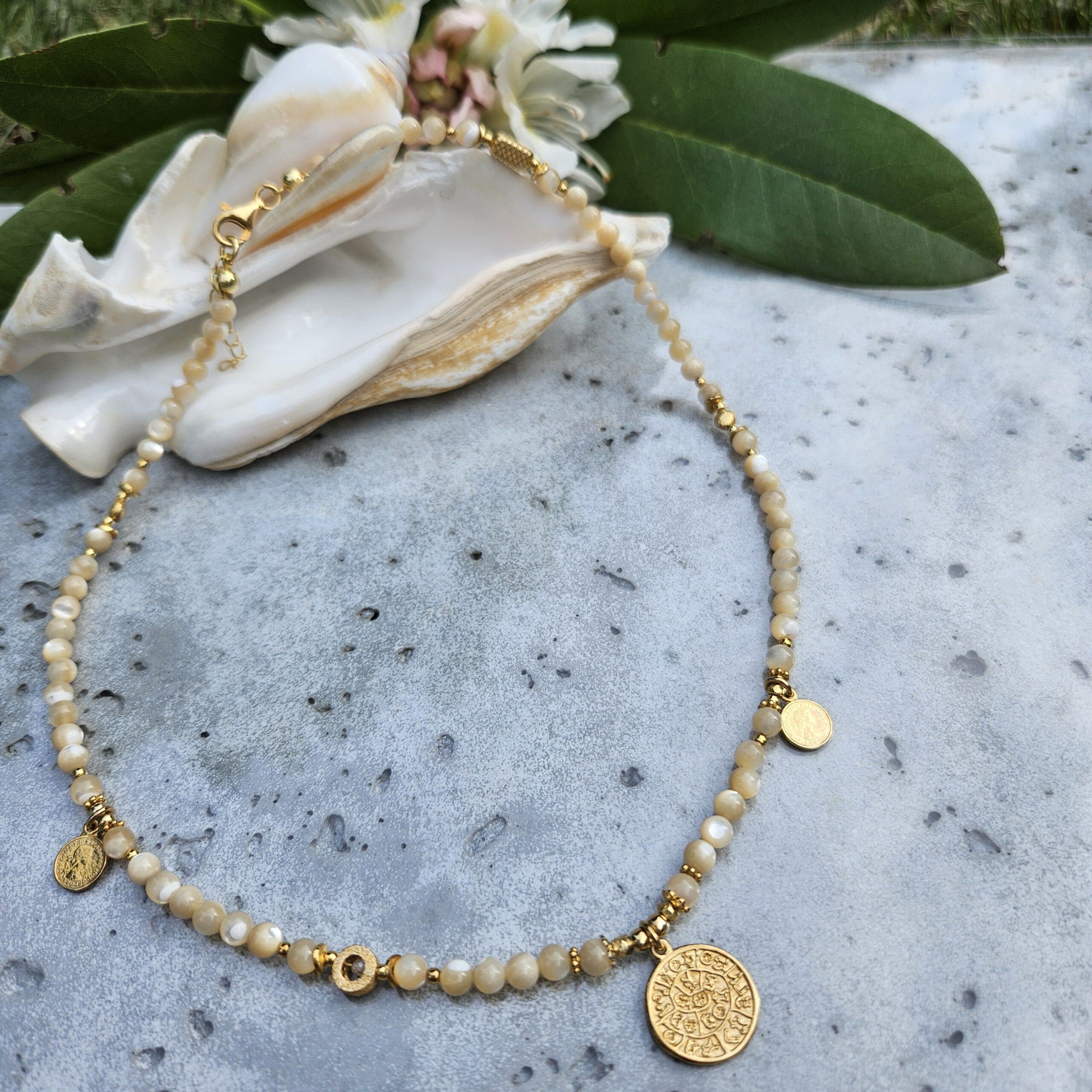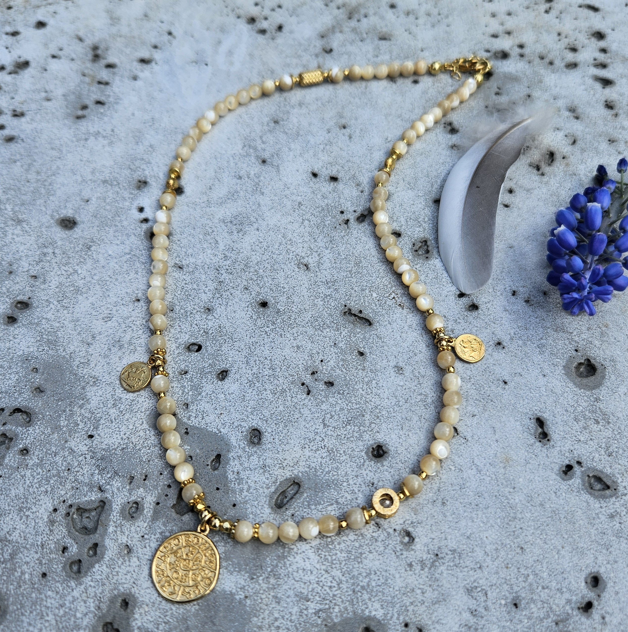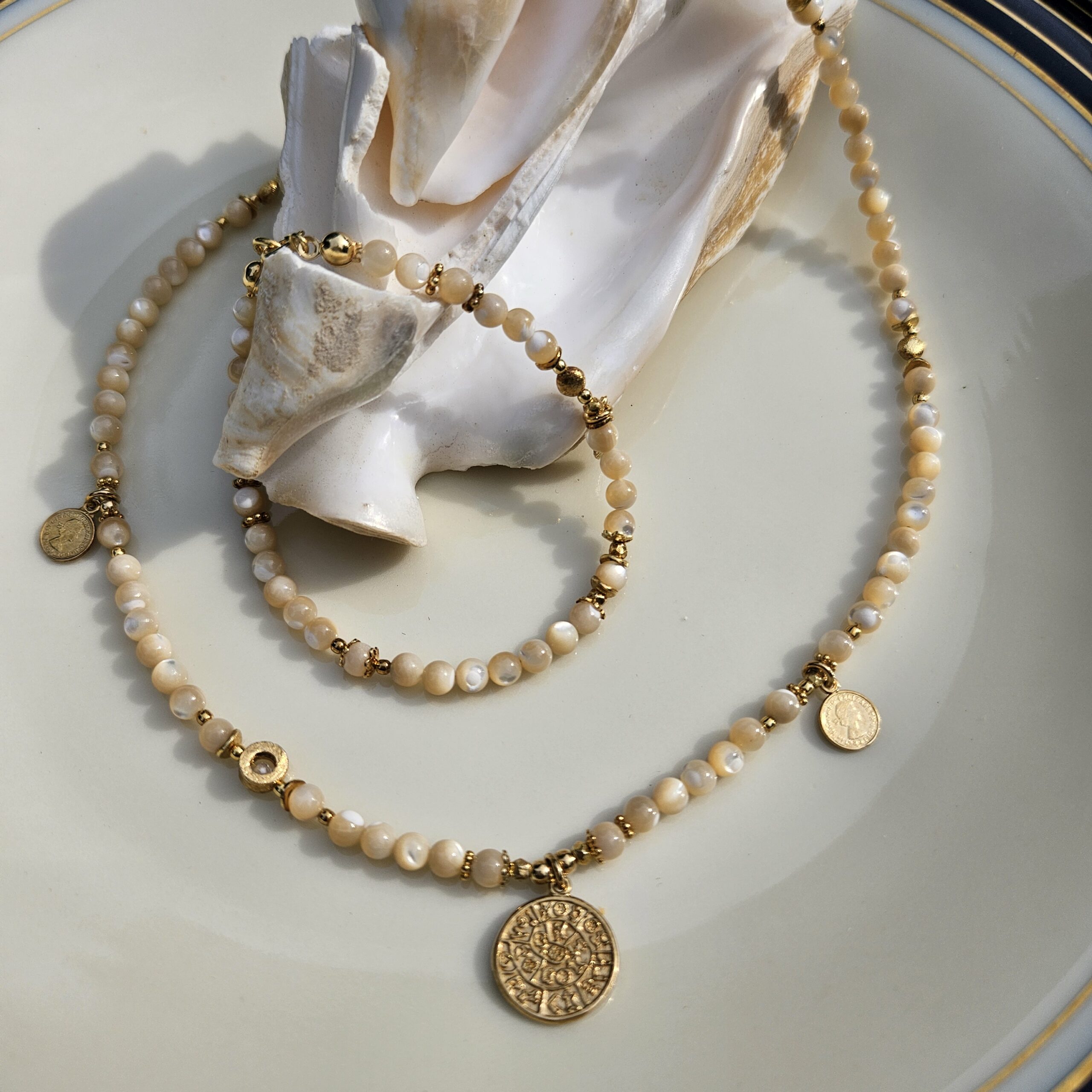 Naszyjnik jest wykonany ręcznie z kremowej masy perłowej o wielkości 4,5 mm. Model ten jest długości 42 cm plus 2,5 cm łańcuszka. Posiada zawieszkę monetkę o średnicy 1,5 cm i dwie małe monetki oraz elementy dekoracyjne ze srebra najwyższej próby pozłacanego 24 k złotem.