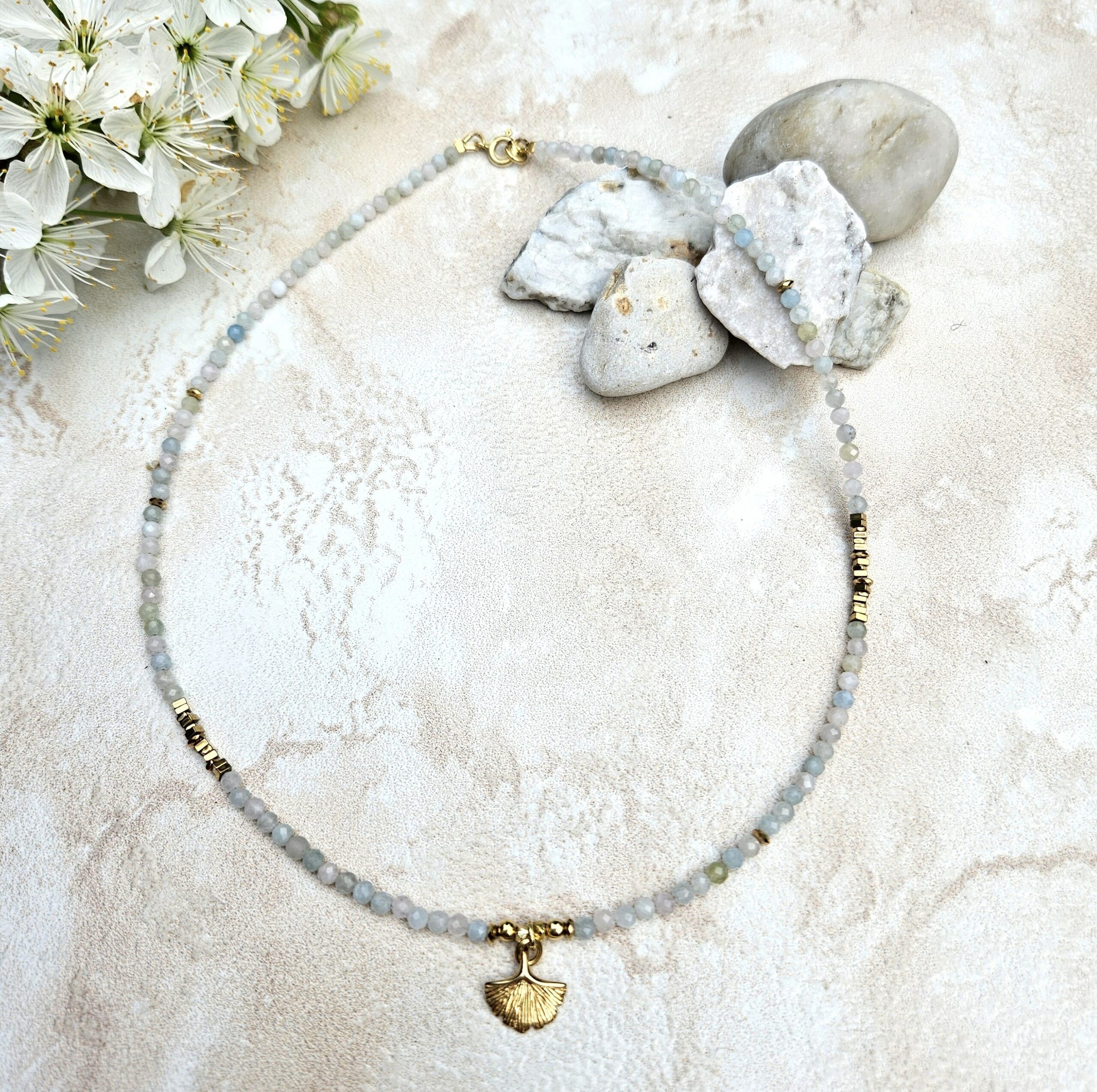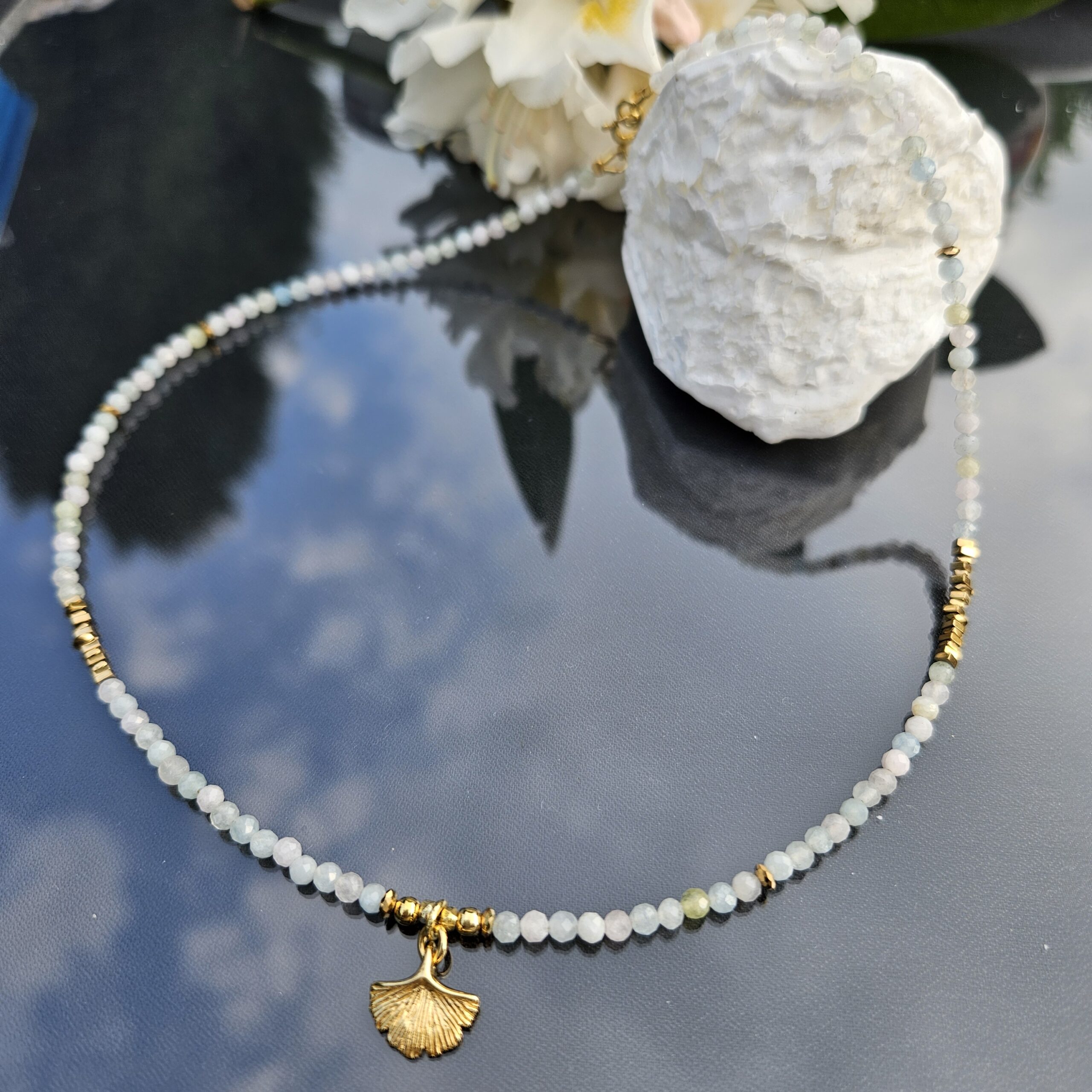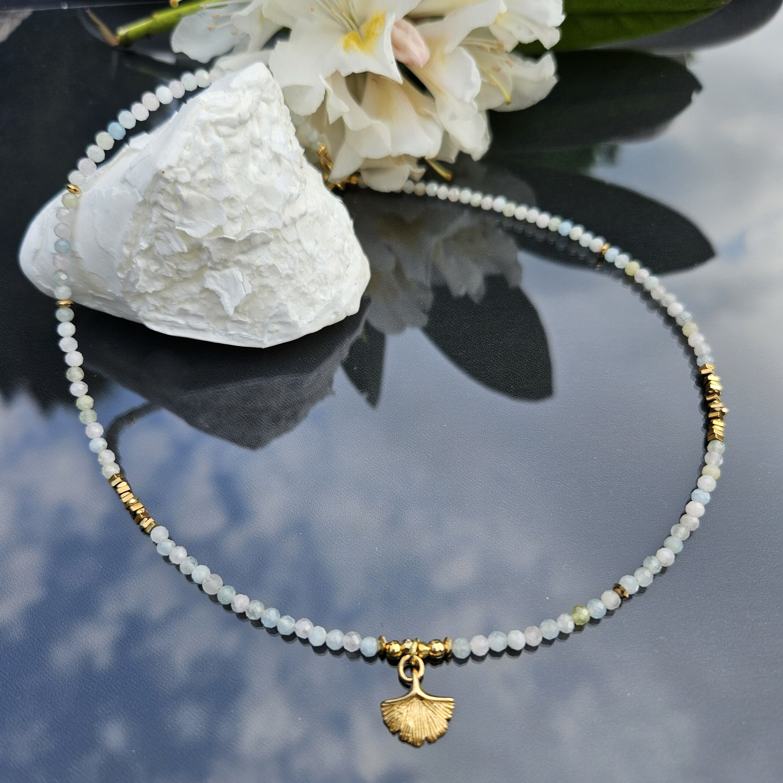 Naszyjnik jest wykonany ręcznie z 3 mm kamieni morganitu, w pastelowych delikatnych kolorach. Model ten jest długości 42 cm. Posiada zawieszkę liść miłorzębu o średnicy 1,2 cm i elementy dekoracyjne ze srebra najwyższej próby pozłacanego 24 k złotem oraz hematyty. Dla ciekawszego wyglądu można nosić z dodatkowym łańcuszkiem.