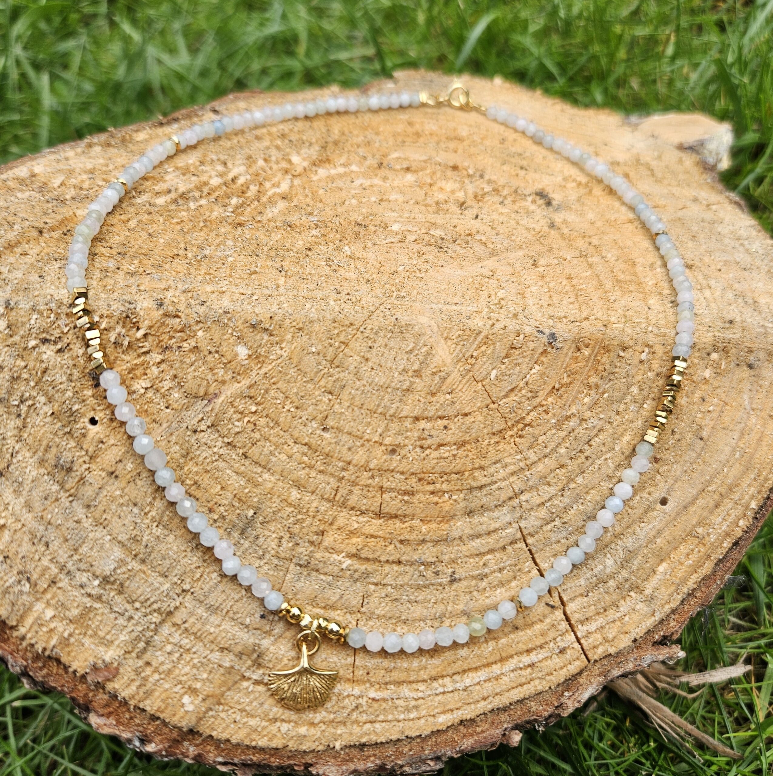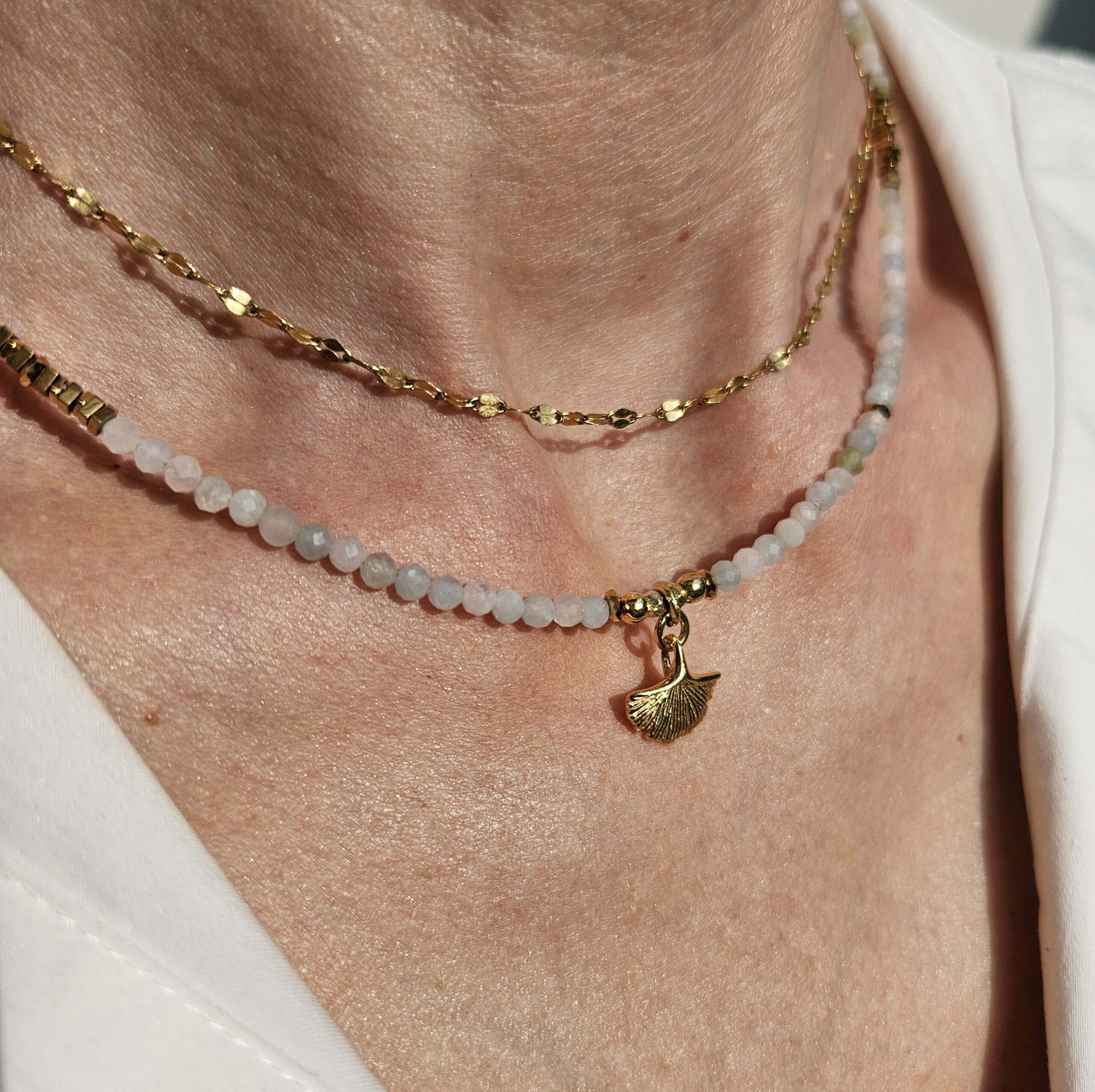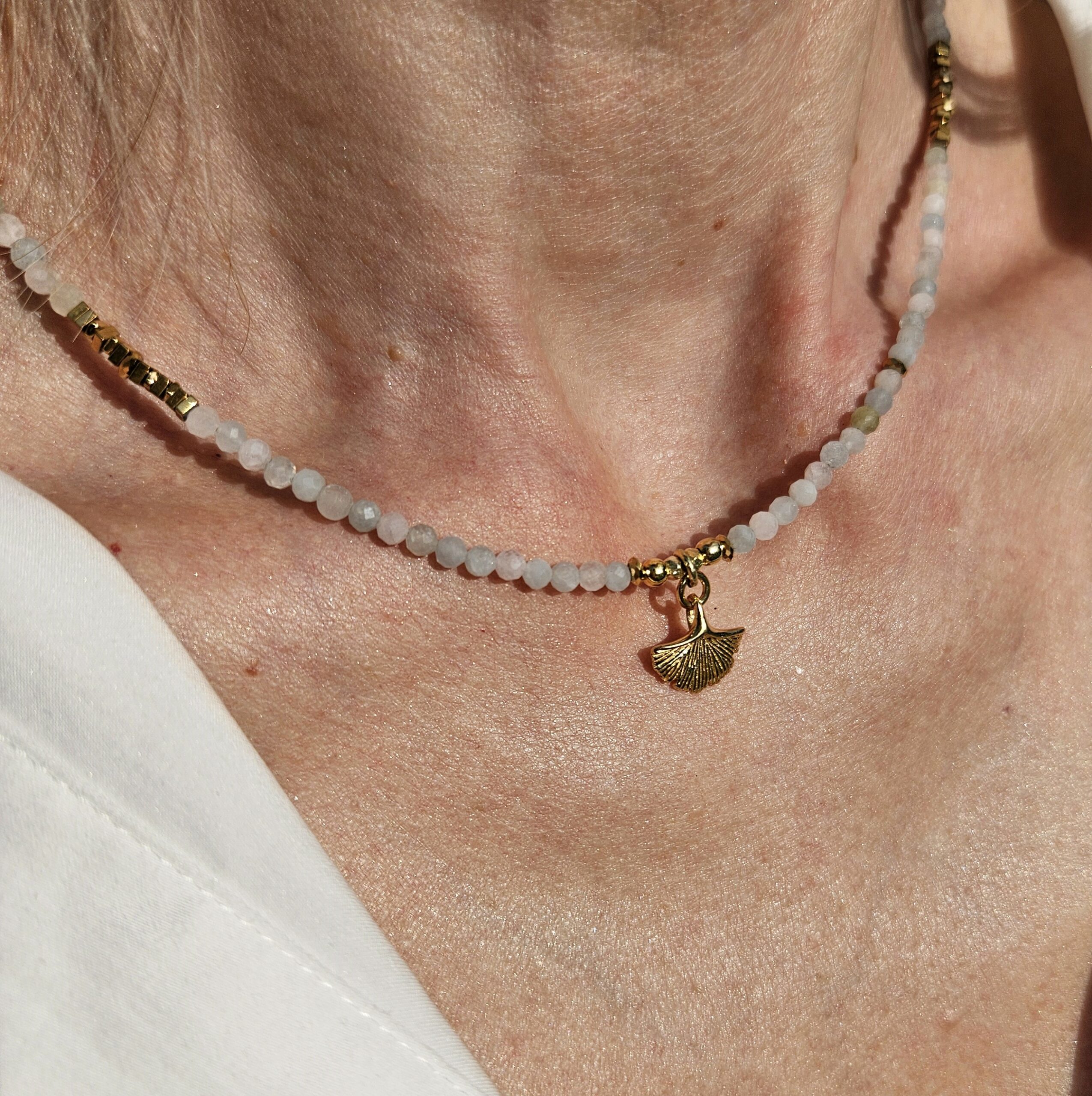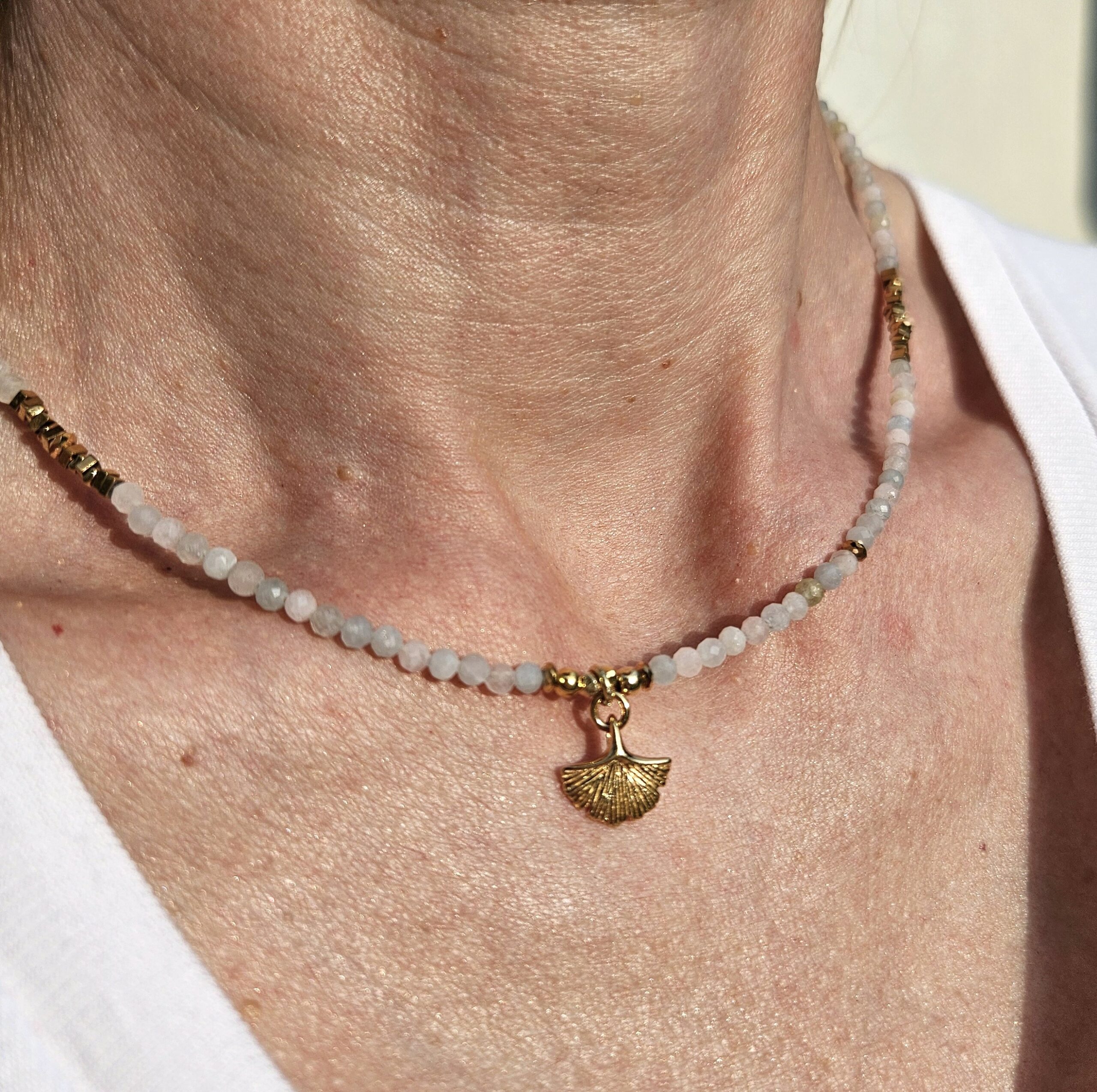 Naszyjnik jest wykonany ręcznie z 3 mm kamieni morganitu, w pastelowych delikatnych kolorach. Model ten jest długości 42 cm. Posiada zawieszkę liść miłorzębu o średnicy 1,2 cm i elementy dekoracyjne ze srebra najwyższej próby pozłacanego 24 k złotem oraz hematyty. Dla ciekawszego wyglądu można nosić z dodatkowym łańcuszkiem.