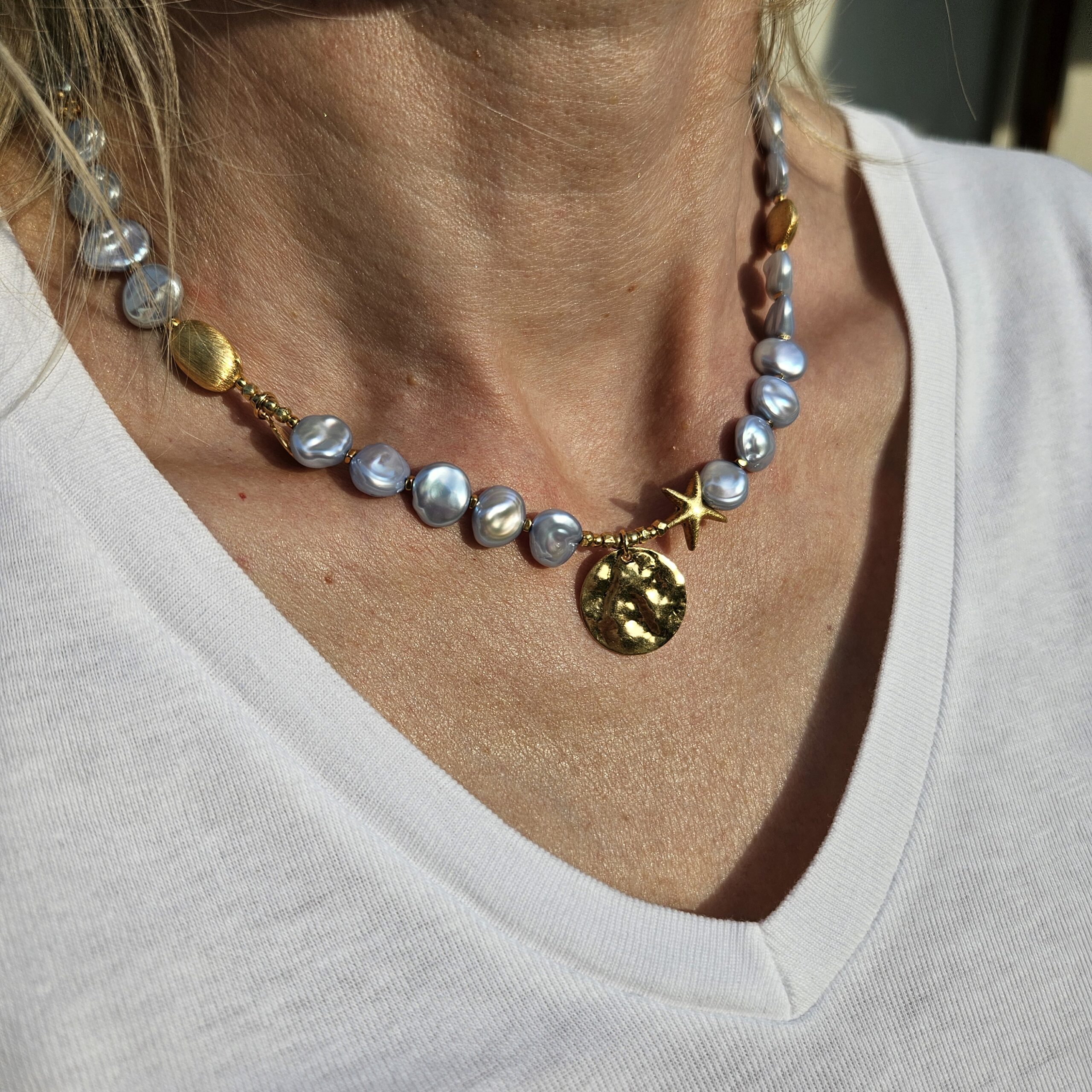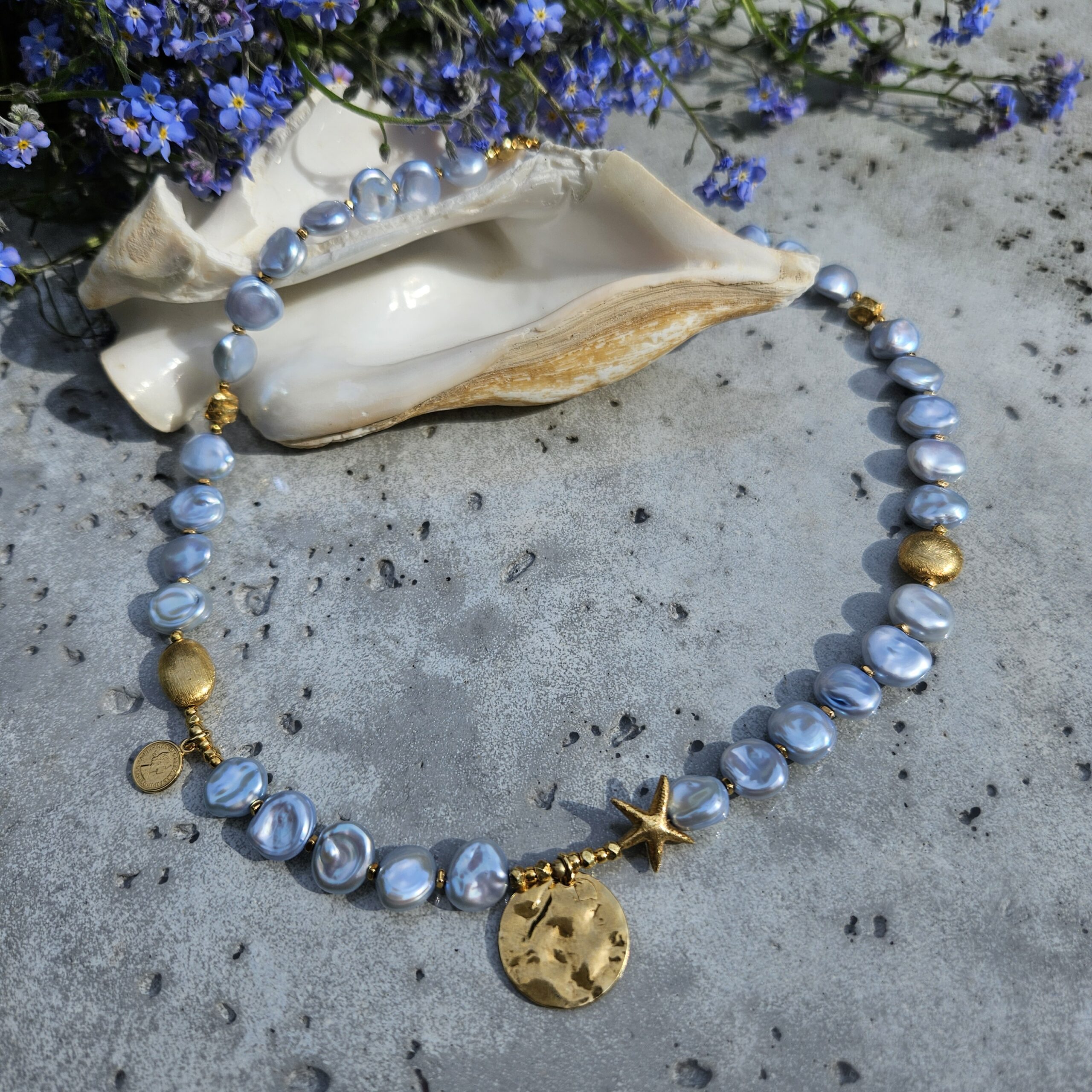 Naszyjnik z naturalnych niebieskich monetkowych pereł z gniecioną okrągłą zawieszką z pozłacanego srebra.