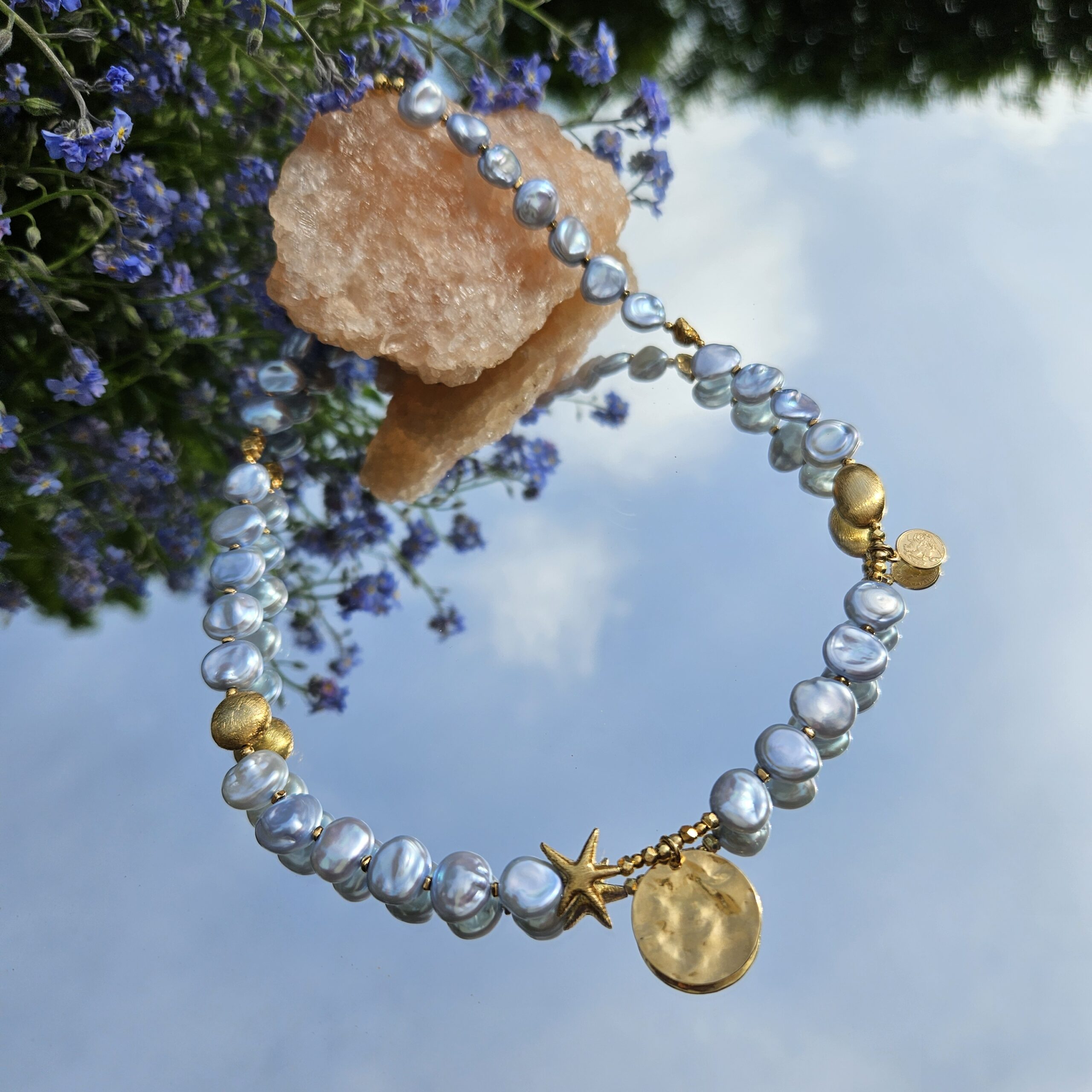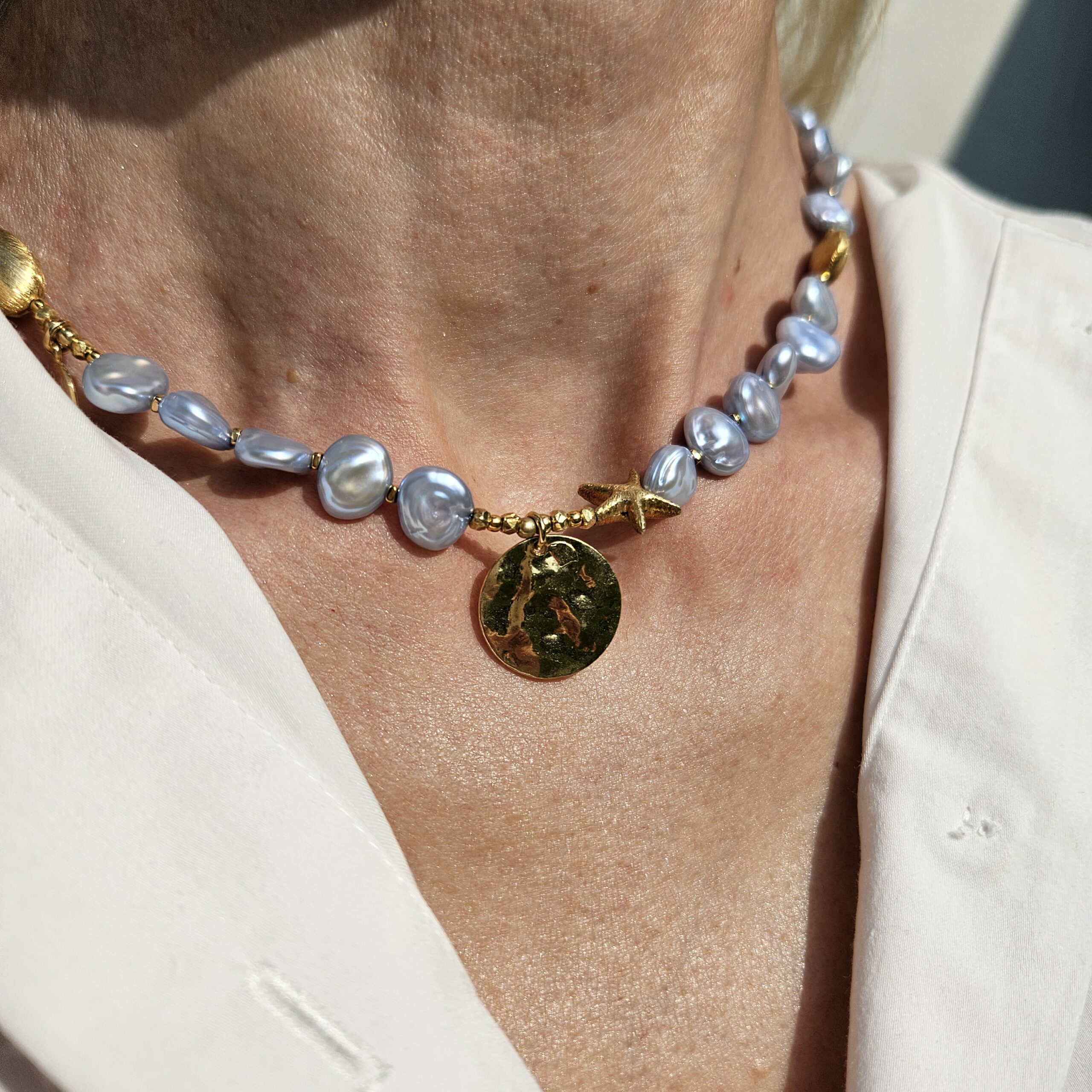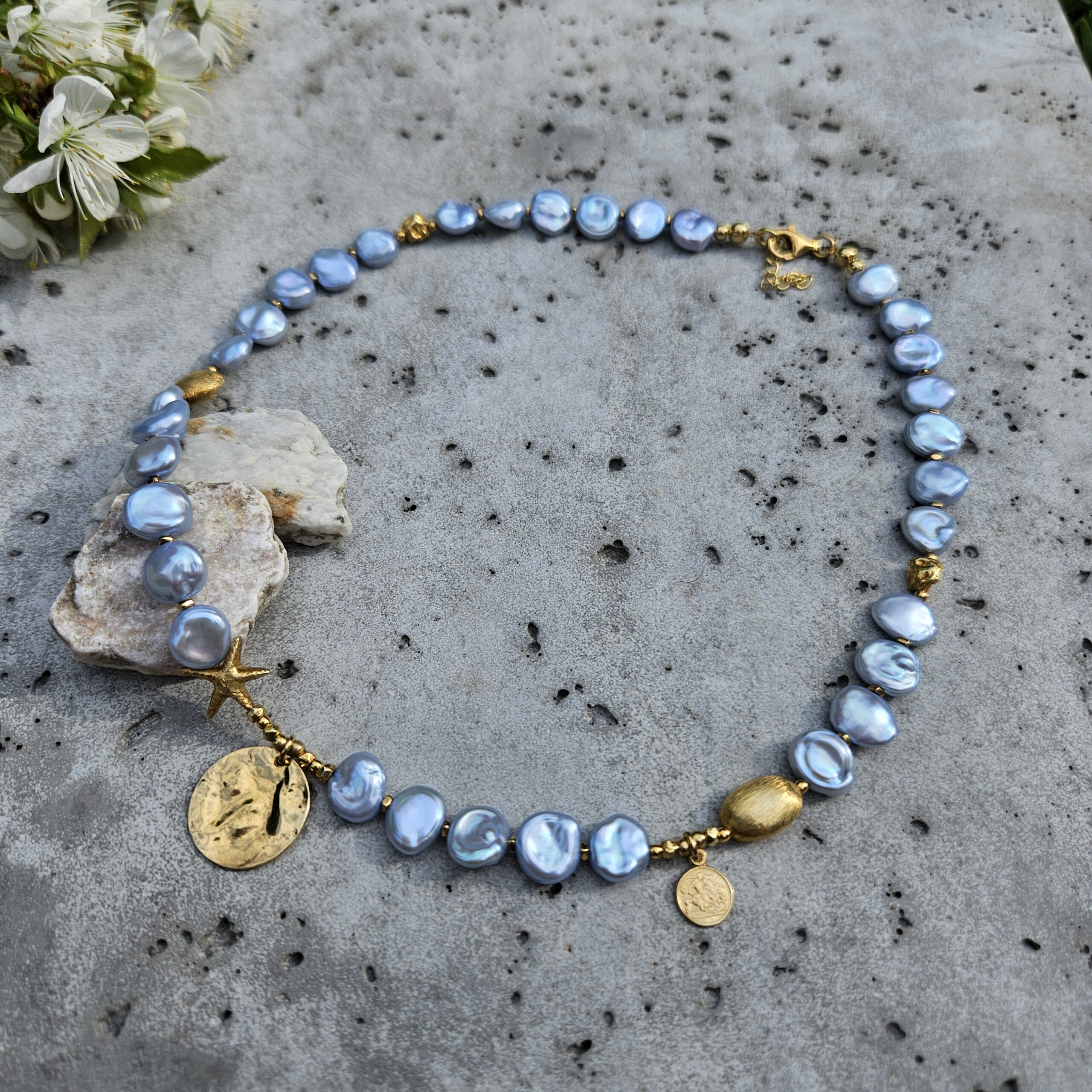 Naszyjnik jest wykonany ręcznie z naturalnych niebieskich monetkowych pereł o nieregularnych wymiarach między 6×10 mm a 8×10 mm. Model ten jest długości 42 cm plus 2,5 cm łańcuszka. Posiada zawieszkę o średnicy 1,8 cm i elementy dekoracyjne ze srebra najwyższej próby pozłacanego 24 k złotem.