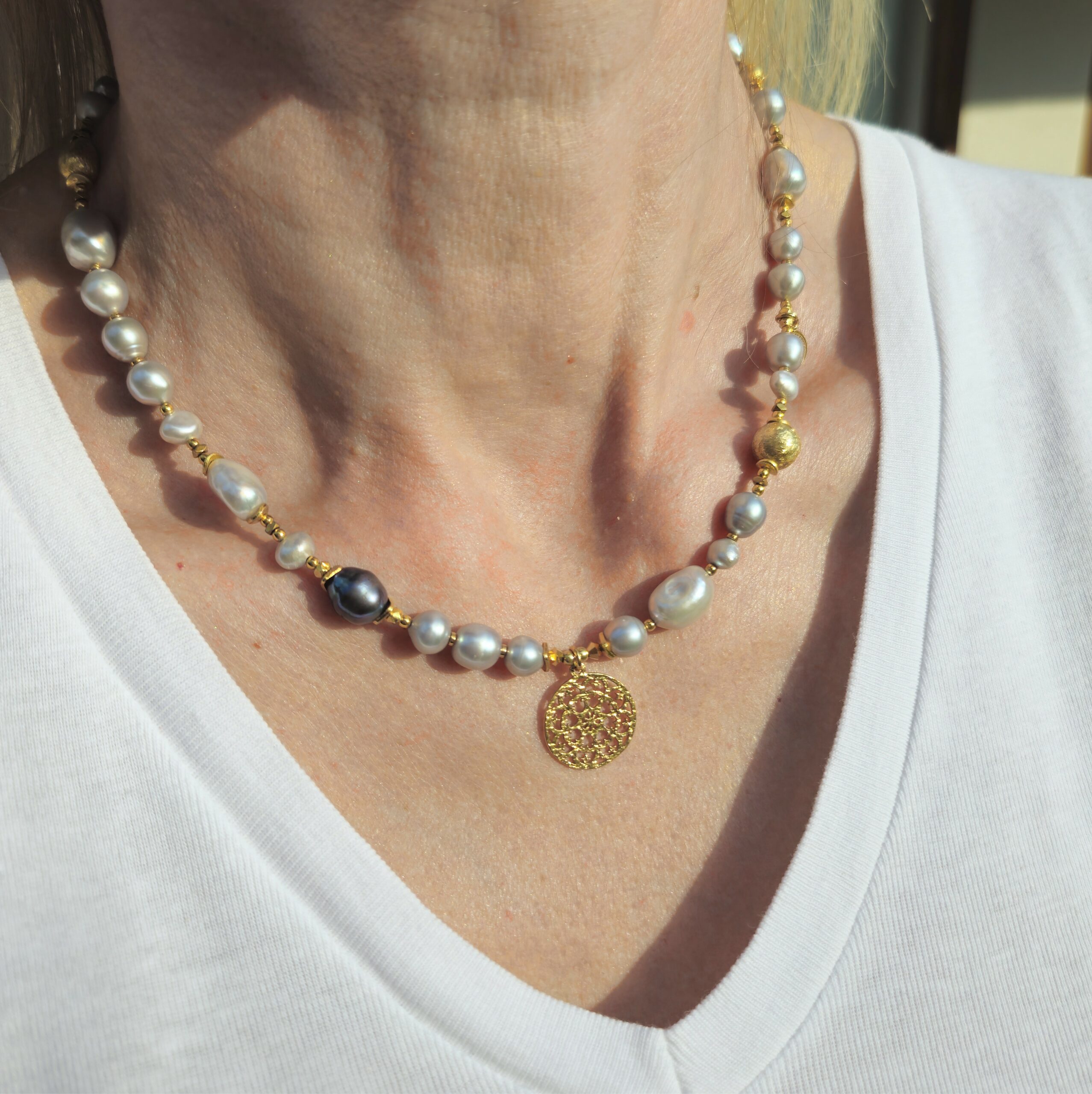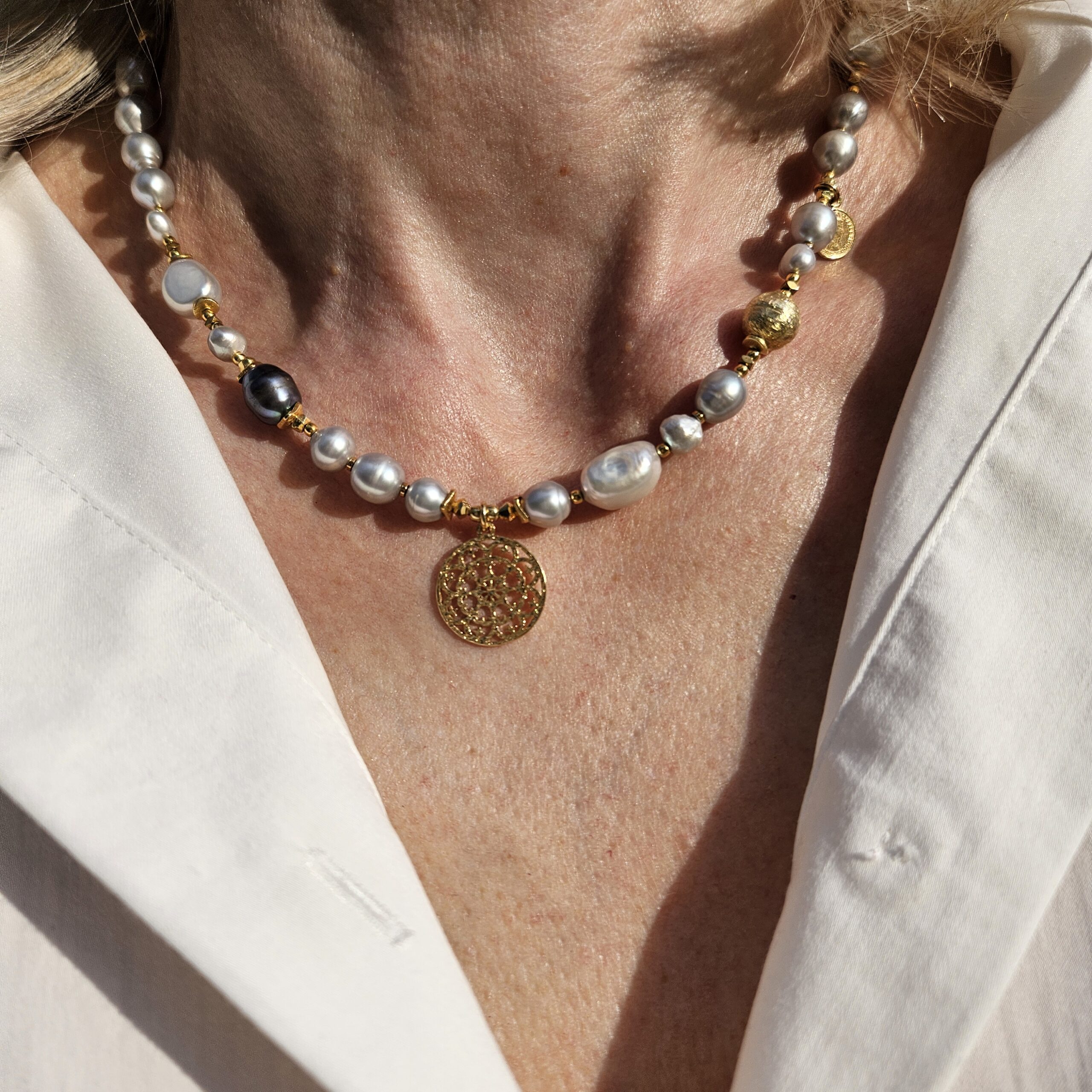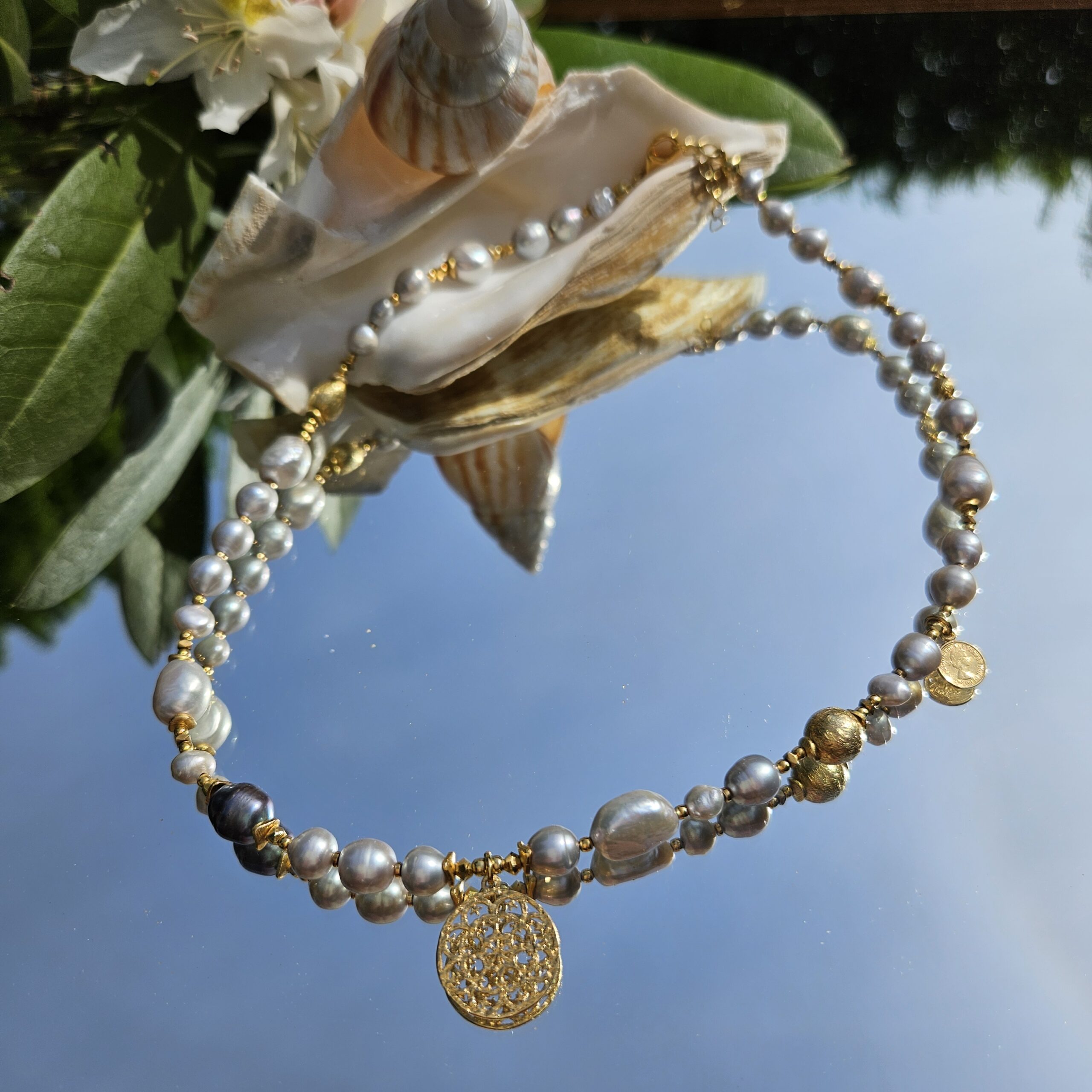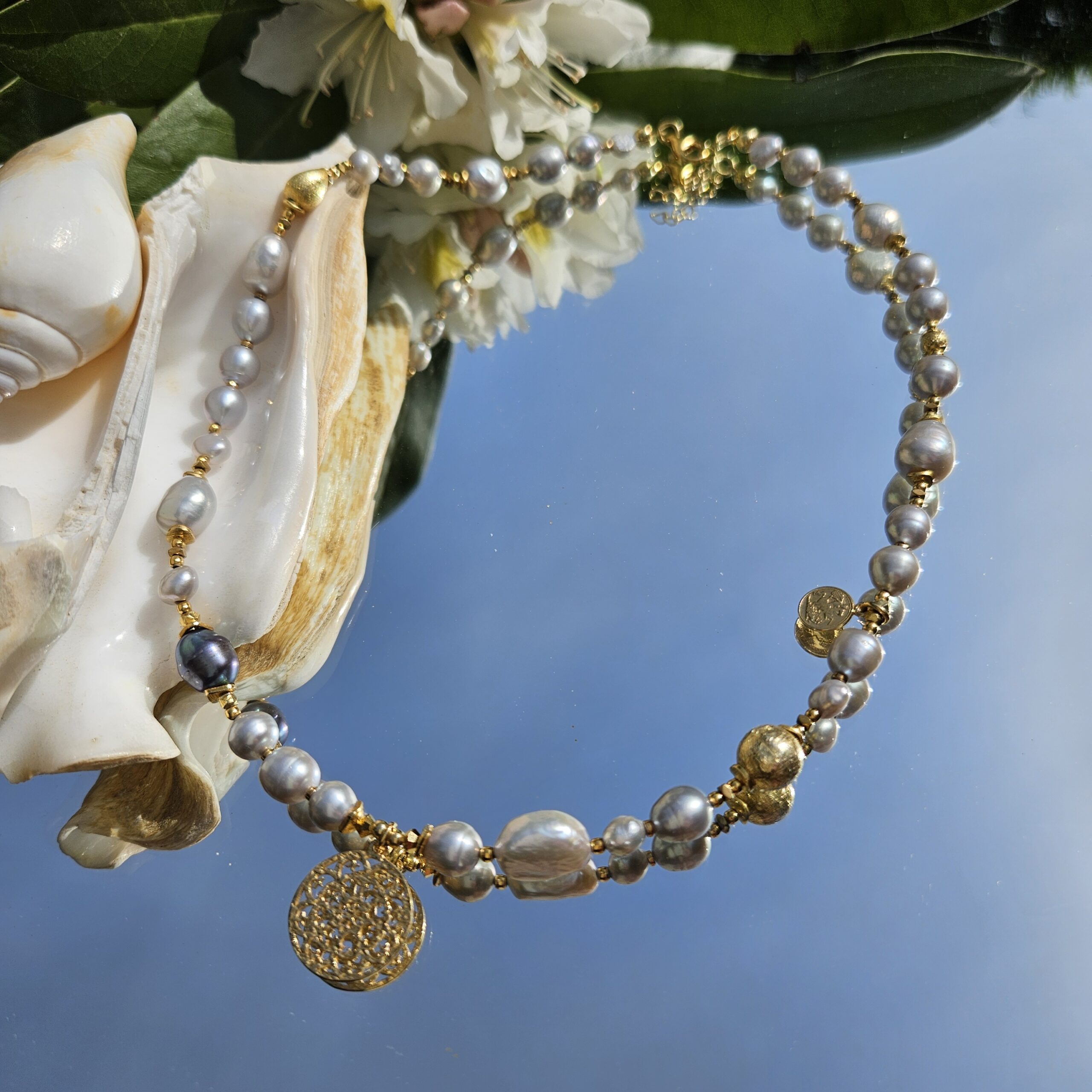 Naszyjnik jest wykonany ręcznie z szarych pereł o nieregularnych wymiarach między 5×6 mm a 8×12 mm oraz z jedną ciemnogranatową perłą. Model ten jest długości 43 cm plus 2,5 cm łańcuszka. Posiada ażurową zawieszkę o średnicy 1,7 cm oraz elementy dekoracyjne i zawieszkę monetkę ze srebra najwyższej próby pozłacanego 24 k złotem.