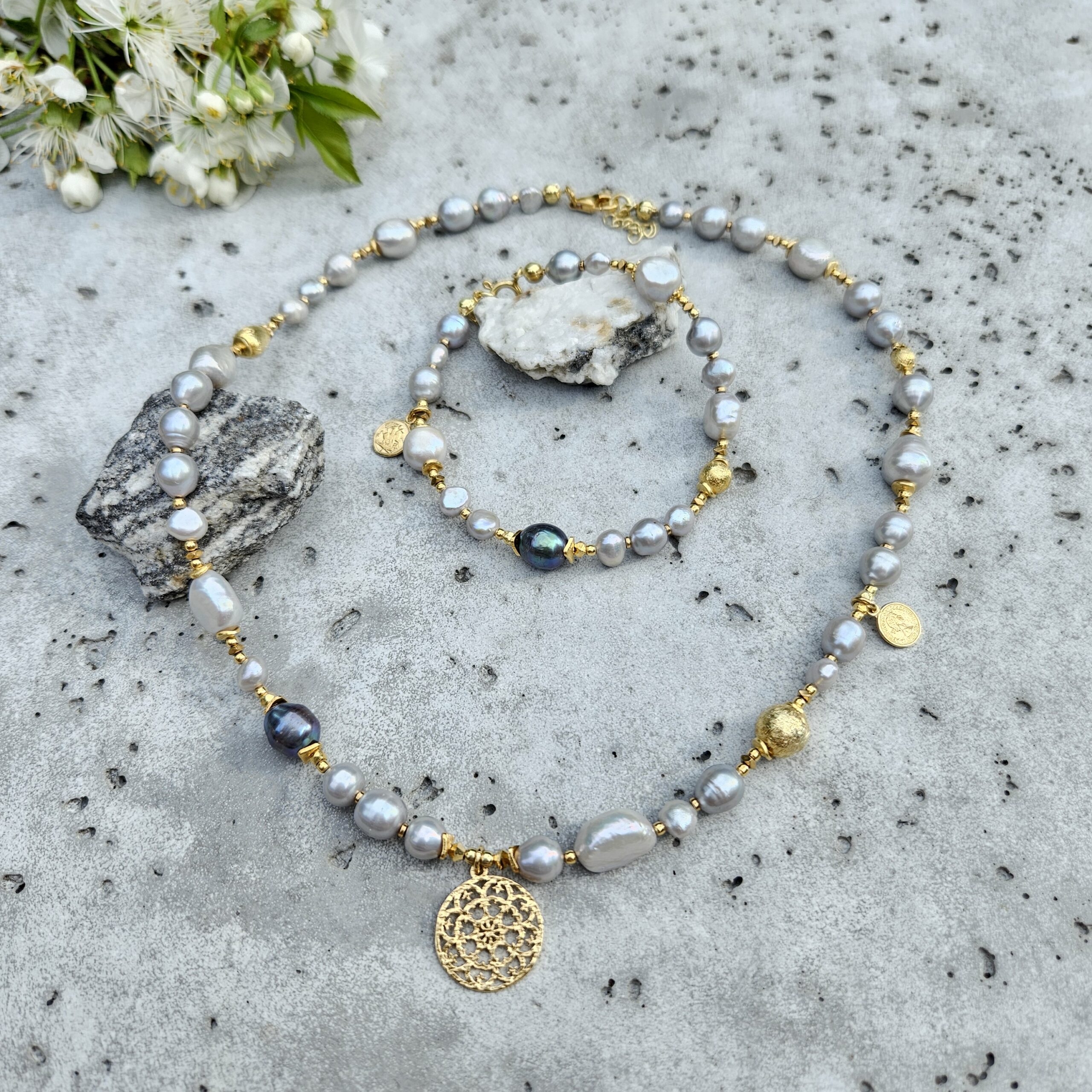 Naszyjnik może być w komplecie z bransoletką z szarych pereł.